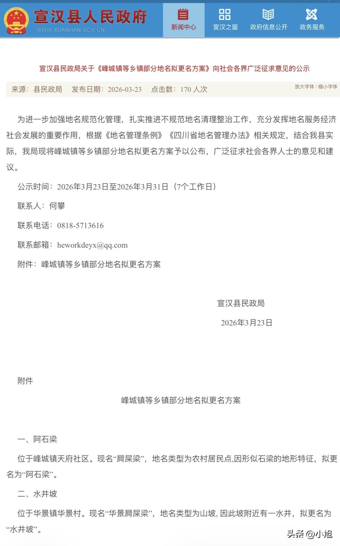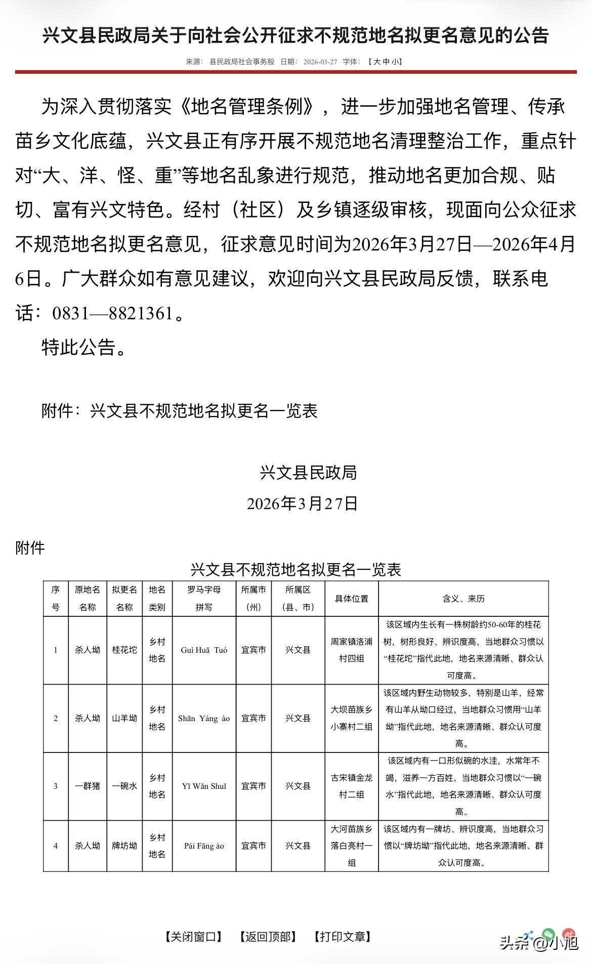 3月28日,四川好几个地方同时发了个公示,要给一批地名改名。 杀人坳,要改成桂花坨。 一群猪,要改成一碗水。 屙屎梁,要改成阿石梁。 还有杀人坪、杀人沟、阿弥陀佛,全都要改。 我盯着这些地名看了半天,心想这都是谁起的名字。 先说这个“一群猪”。位置在宜宾兴文县古宋镇金龙村二组。当地村民说,那里有一口形似碗的水洼,水常年不竭,大家习惯叫“一碗水”。那“一群猪”是咋来的?没人解释。村里老人可能知道,但估计不太愿意提。你说你住的地方叫“一群猪”,外人问你家住哪,你怎么开口? 再说“杀人坳”。兴文县就有三个地方叫这名,一个因为有桂花树要改桂花坨,一个因为经常有山羊经过要改山羊坳,一个因为有个牌坊要改牌坊坳。你品品,这些地方原来都叫杀人坳,但当地人自己平时根本不这么叫,他们叫桂花坨、叫山羊坳。也就是说,这个“杀人坳”的名字,可能只是地图上的一个符号,跟老百姓过日子没半毛钱关系。 达州宣汉县的“屙屎梁”更绝。峰城镇天府社区那个,因为地形像石梁,要改成“阿石梁”。华景镇那个,因为坡附近有口水井,要改成“水井坡”。土黄镇那个,因为山梁上自古长着枫箱树,要改成“枫箱树大梁”。你看,每个名字背后都有实实在在的东西——水井、树、石头。但原来那个“屙屎梁”是怎么来的?没人说得清。 还有万源市黄钟镇烂祠堂村的“阿弥陀佛”,要改成“圆盘石河坝”。这个名字最有意思,听着像是个寺庙或者跟佛教有关,结果就是个地名,老百姓念了几辈子,现在要改成圆盘石河坝。你说改就改吧,反正平时叫顺口了的还是照叫。 其实这事背后的逻辑很简单。 2026年1月1日起,新的《四川省地名管理办法》开始施行,明确要求清理整治“大、洋、怪、重”等地名乱象。什么叫怪?杀人坳、屙屎梁、一群猪,这些就属于“怪”——怪异难听,不符合公序良俗。官方说法是“传承苗乡文化底蕴”“推动地名更加合规、贴切、富有兴文特色”。 说白了,就是地名也得讲究个脸面。 以前那些地名怎么来的?老辈人随口起的。可能是哪年哪月出了个事,可能是哪个地形看着像什么,可能是纯粹图省事。一代传一代,传着传着就成了地名。但你要问这名字好不好听、雅不雅致,那肯定谈不上。 我查了下,这次四川多地都在搞这个事。宜宾兴文县、达州宣汉县、万源市都发了公示,征求社会意见。意见征求时间也不长,就这几天到4月初。也就是说,这些叫了几十年甚至上百年的名字,可能过完清明节就正式变了。 有人可能要问,改个名能咋的?该杀人坳还是杀人坳,该屙屎梁还是屙屎梁,老百姓嘴上不照样叫? 这话说对了一半。官方改了名,地图上、身份证上、快递地址上都会变。但当地人怎么叫,那是另一回事。一个地方叫什么,从来不是一纸文件能决定的。就像你家门口那棵老槐树,你叫它老槐树,地图上标什么名字你根本不在乎。 你还知道哪些奇怪的地名?