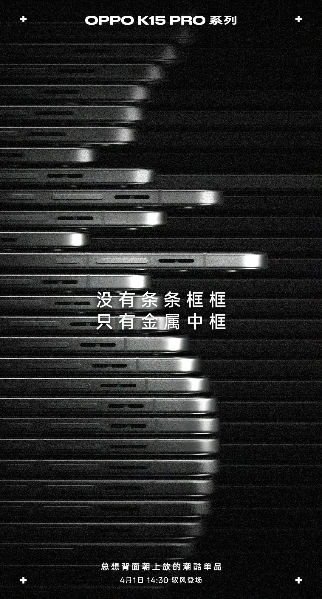 OPPO K15 Pro 系列手机将于 4 月 1 日 14:30 发布,最新预热显示,这款新机采用岚影呼吸灯搭配金属中框,号称“总想背面朝上放的潮酷单品”。