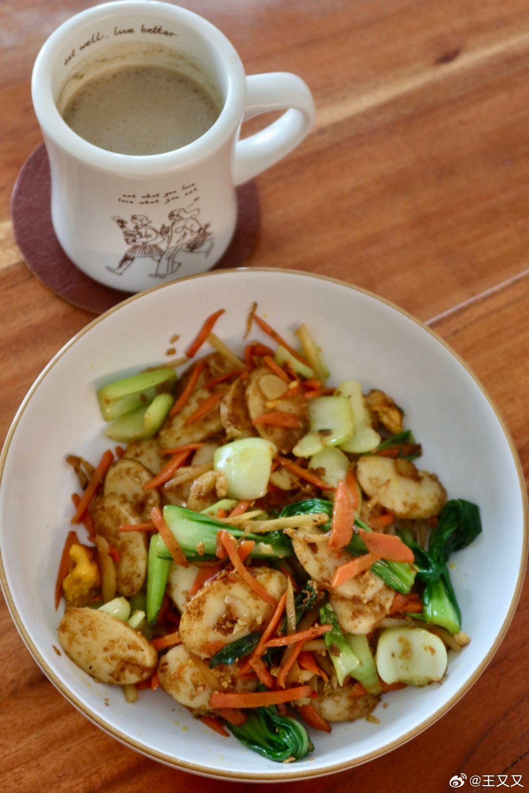 午餐:胡萝卜🥕上海青炒年糕、焙茶椰奶拿铁