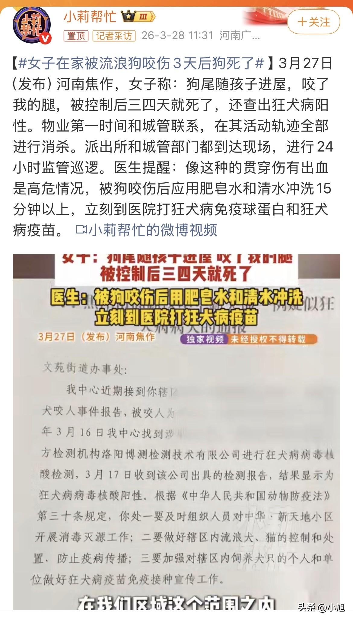 3月27号河南焦作,一个女的在家被狗咬了。 不是她养的狗,是条流浪狗。 当时家里有小朋友来玩,门没关严,那条狗就跟着孩子溜进来了。辛女士从楼上下来的时候,狗已经在笼子边上了。她想把狗赶出去,狗不走,回头就咬了她腿一口。 贯穿伤,有出血。 她去医院了,处理了。但事情真正让人后背发凉的,是后来的事。 那条狗被物业控制住之后,没撑过三四天就死了。死了以后送去查,狂犬病阳性。 很多人看到这条新闻,第一反应是“幸亏狗死了查出来了,不然人还不知道危险”。但换一个角度想,如果这条狗咬完人之后没死呢? 它咬完人跑掉了,继续在小区里晃。辛女士被咬了,去医院打了疫苗,但可能没打免疫球蛋白,可能冲洗伤口不够彻底。然后狗一直活着,没人想到去查它。辛女士也不知道自己到底有没有感染。她每天照常上班、带孩子、做饭。脑子里偶尔闪过那条狗,想一下,也就过去了。 直到有一天,她开始怕风、怕水、喉咙发紧。到那时候,什么都晚了。 狗死了,反而是一件好事。 不是因为狗该死,而是因为它的死,成了唯一一个能让所有人意识到危险已经发生的信号。狗要是不死,这件事的结局可能就是“一个女的被流浪狗咬了,打了疫苗,没事了”。但真相是,她可能有事,只是谁都不知道。 这个逻辑说出来很残酷。一条狗的死亡,成了一个人的救命稻草。 再往下想一层。 狗为什么会死?因为它发病了。狂犬病发作的狗,几天之内必死。它咬人的时候,已经是一个行尸走肉了。它的脑子里全是病毒,它不知道自己是谁,不知道自己在哪,它只剩一个本能——攻击。 但问题来了。这条狗在发病之前,在小区里晃了多久?有没有人喂过它?有没有人摸过它?有没有小孩跟它玩过? 狂犬病毒在狗身上有潜伏期。潜伏期里,狗看着好好的,精神正常,不乱咬人。但它的唾液里可能已经有病毒了。只是量不够,或者还没进入攻击阶段。等到病毒攻进大脑,狗才开始发疯,开始乱咬人,然后几天之内就死。 这意味着什么?意味着这条狗在“看着正常”的那段时间里,可能已经接触过很多人。那些喂过它的人,可能手上沾了它的口水。那些摸过它的人,可能手上有个倒刺、有个小伤口。那些跟它玩过的小孩,可能被舔了一下脸。 那些人现在在哪?他们知不知道,自己几天前摸过的那条“还挺乖”的流浪狗,其实是狂犬病阳性? 没人知道。 物业说他们对狗活动过的地方做了消杀。消杀能消掉地上的病毒,但消不掉已经接触过狗的人心里的那根刺。 街道办事处说要加强狂犬病防治宣传。宣传能让人知道被咬了要打疫苗,但那些没被咬只是摸过狗的人,不会觉得自己需要打疫苗。 这才是整件事最让人不安的地方。所有人都把注意力放在“被咬的那个人”身上。但狂犬病毒传播最隐蔽的方式,从来都不是咬。 世界卫生组织的数据说,狂犬病传播途径里,咬伤占了99%。但剩下那1%里,有多少是唾液接触了看不见的伤口?没人统计,因为那些人根本不会去医院。 辛女士是幸运的。她被咬了,狗死了,查出来阳性,她知道自己暴露了,该打什么打什么。真正危险的是那些没被咬的人。 那条狗在小区里生活了多久,就有多久的时间在散播病毒。它舔过的地面、吃过的食盆、蹭过的墙角,都可能有病毒残留。狂犬病毒在干燥环境下几小时就死了,但在潮湿低温的环境里,能存活好几天。 物业消杀了两遍。但消杀之前,那条狗已经在小区里晃了好几天。 这件事说到底,不是谁的责任问题。是大家心里对狂犬病的认知,还停留在“被狗咬了要打针”那个层面。但真正要防的,是那些看着正常的流浪动物。它们不是在发疯的时候才危险。它们在整个潜伏期里,都在不知不觉地制造风险。 辛女士接受采访的时候说,狗是跟着孩子进门的。她当时只想着把狗赶走,没想到会咬人。 她没做错什么。任何一个正常人在家看见流浪狗,第一反应都是赶走。但她不知道那条狗已经在发病了。狗站在她家客厅里的时候,脑子里已经全是病毒了。它不是在“不听话”,它是控制不住自己。 这事如果发生在我身上,我也不一定能躲过去。 你们觉得呢。如果那天狗跟着孩子进门的时候,你也在家。你看见那条狗,你会怎么处理。你会伸手去赶它,还是直接把孩子拉进房间关门报警。你会觉得它就是条普通流浪狗,还是能一眼看出它在发病。 来源:都市现场综合小莉帮忙、南昌疾控;新浪新闻;搜狐新闻