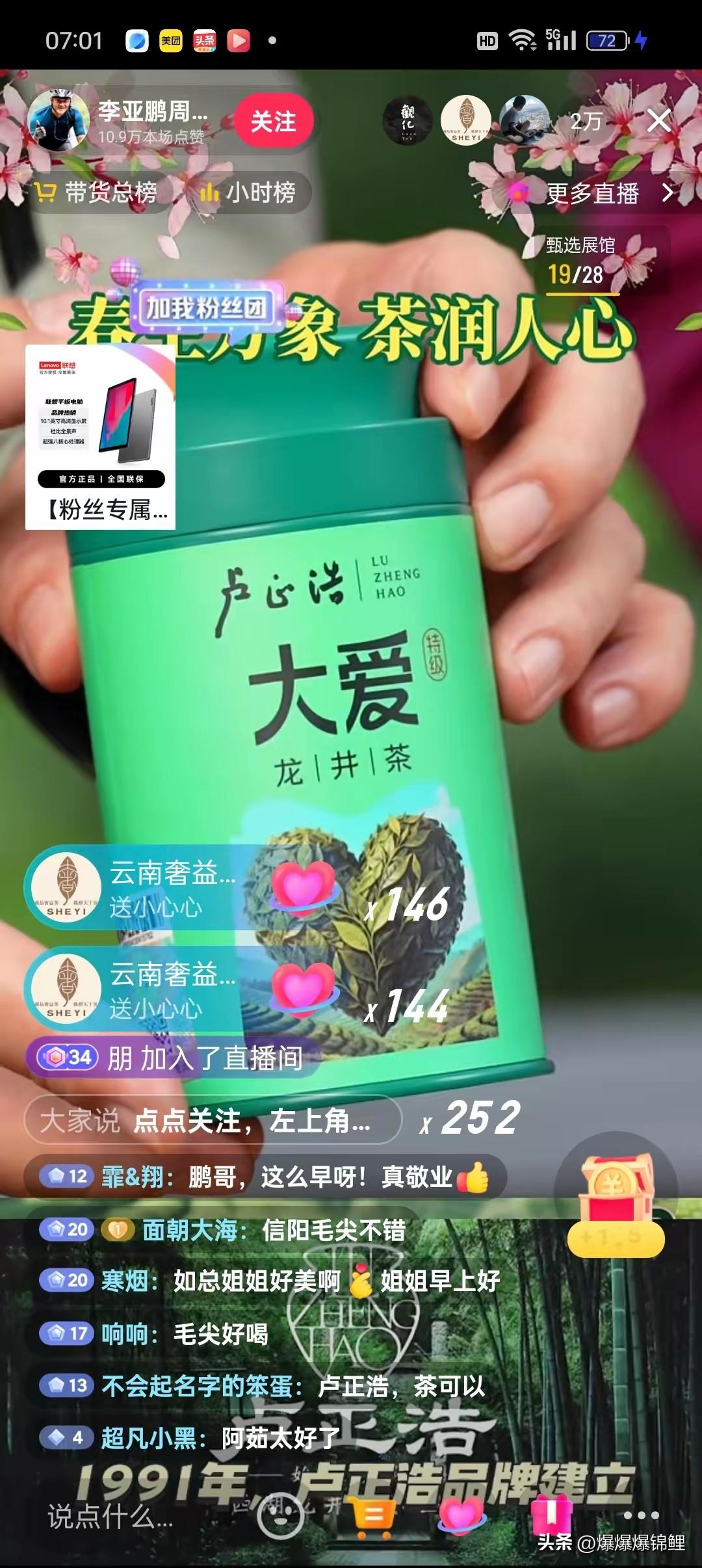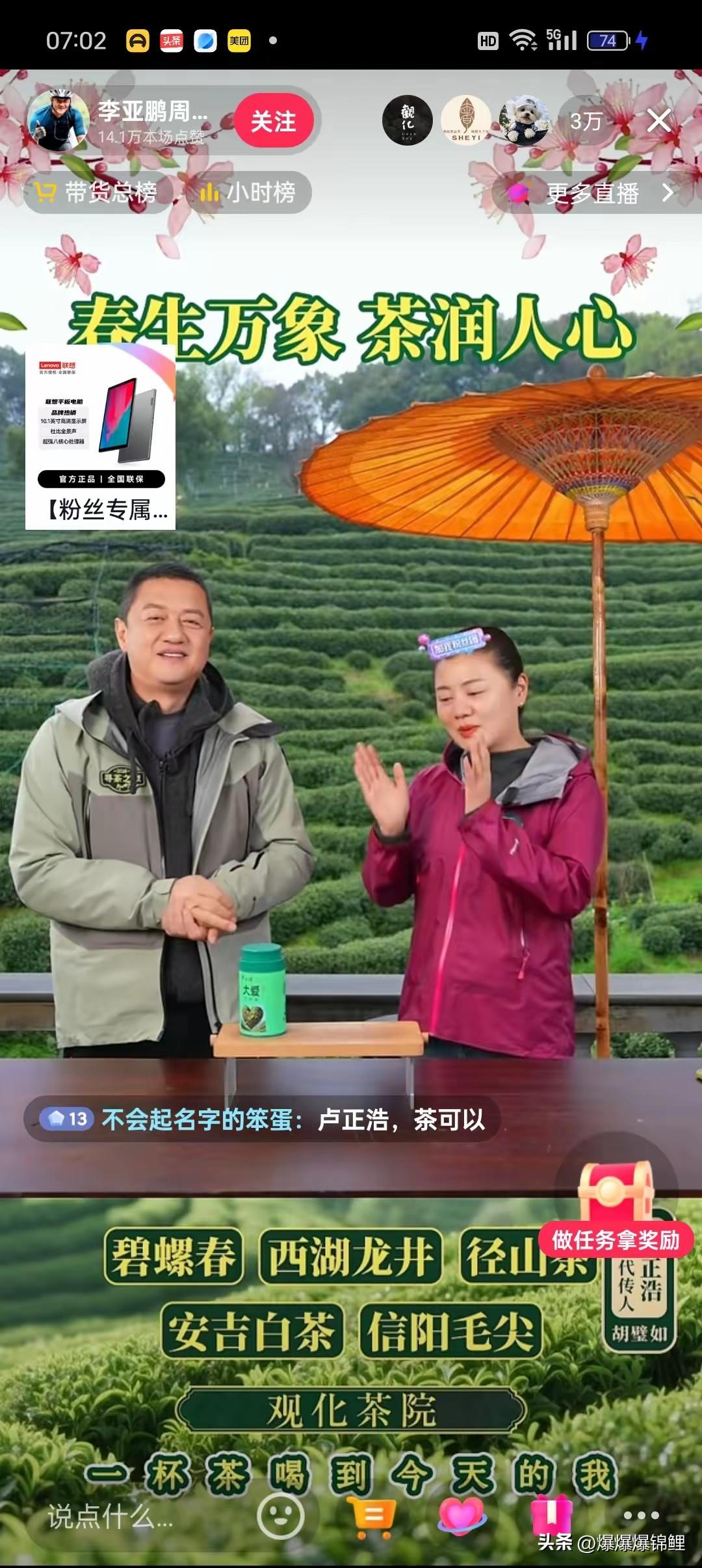 本来我都捂紧钱包,就等3月31号“与辉同行”的杭州龙井溯源专场了。 结果好家伙,李亚鹏居然提前跑到杭州开播,直接来了一波截胡! 昨天硬是忍着看了一天没掏钱,想着怎么也得等宇辉他们上链接,货比三家。 谁知道今天一大早李亚鹏又播上了。卢正浩的品牌方更是懂流量,直接给他弄了个“专属定制款”。 直播间里那位老板娘的话让人听着挺感慨。 直言对李亚鹏是“始于颜值忠于人品”,还特意强调被他做公益的“大爱”感动,号召粉丝下单。 我觉得吧,现在这直播带货真卷。一边是苦等的文化牌,另一边直接拿人品背书。 冲着这波情怀,估计真有不少人去支持。至于谁卖的茶更极品,就看月底那场怎么接招了。