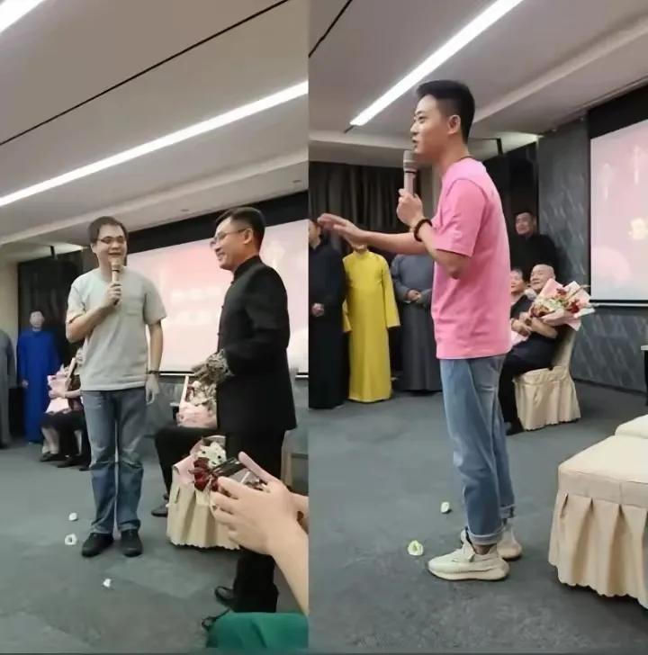 杨进明收徒,高峰和栾云平都到场见证,也讲了话送上祝福 现场布置得挺有仪式感,背景墙上打着“树有根,水有源”几个字,旁边还摆了侯耀文先生的照片,传承的味道一下子就出来了。 杨进明自己也在社交平台上发了动态,说“收了几个徒弟”,前一天还晒了合照,看得出挺看重这份仪式。 自从加入德云社这几年,他状态一直保持得不错。虽说已经70多岁了,小剧场演出没耽误,时不时还跟着社里演员跑跑全国商演,顺道也走走看看,用他自己的话说,算是迎来了“人生第二春”,日子过得挺充实。 有时候想想,人到了这个岁数,还能在喜欢的行当里活跃着,身边有徒弟传承,台上有观众捧场,这份热热闹闹的充实感,其实挺难得的。不管在哪个行业,能找到让自己投入、也觉得值得的状态,就是一种福气。
