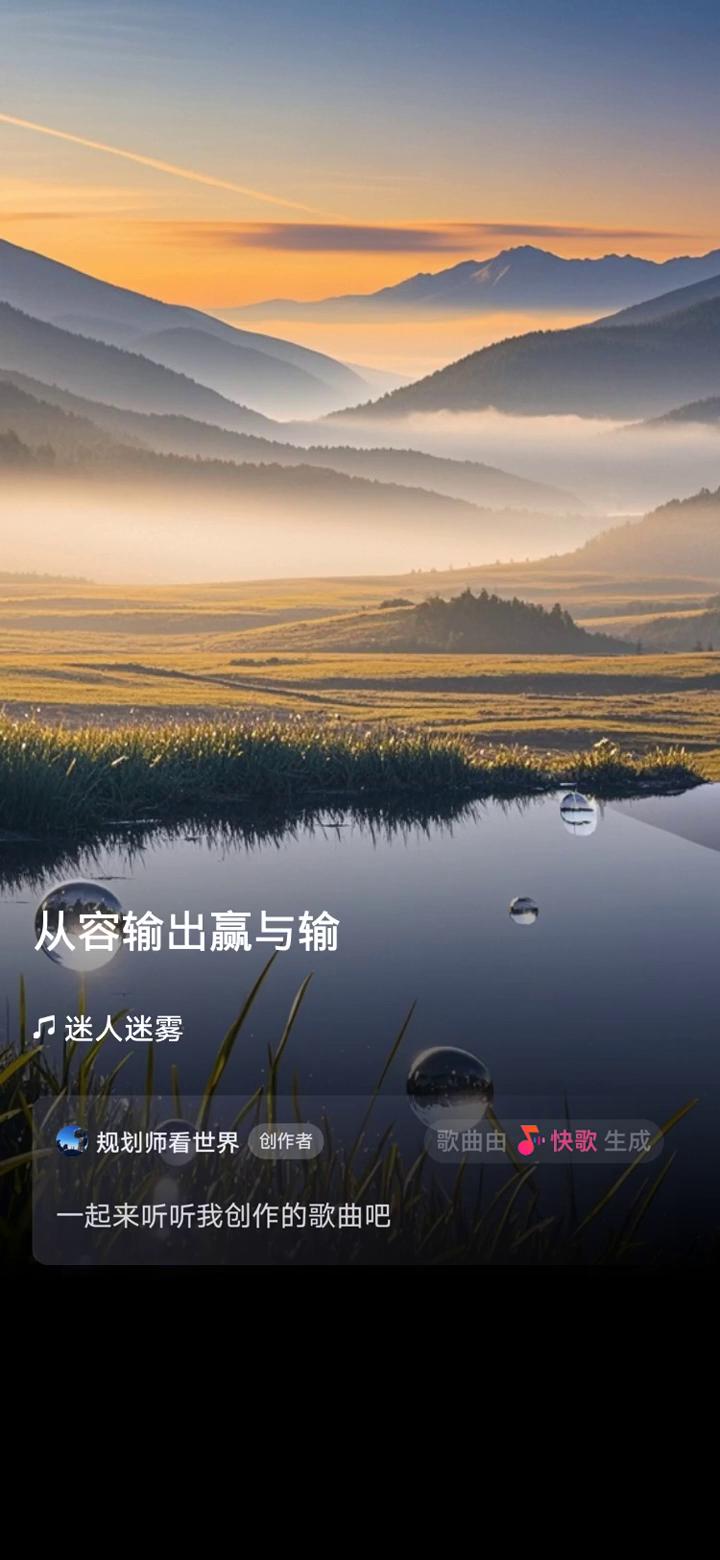 迷人迷雾。 规划师看世界创作者。 歌曲由快歌生成,一起来听听我创作的歌曲。 轻浮误入荒芜的孤独山谷,独户模糊哀伤慢慢凝固,光明勇气岂能轻易被黑暗俘虏。细小失误细查一路的守护,无人帮助也要苦苦地跨越无人荒。汗珠泪目汇聚的湖是独一无二的,想得太甜活得太苦。年轻的脸庞年迈的脚步,纷纷扰扰世界有无,自由自在自然不辛苦。心灵解脱身心奔赴,重重的艰苦重重地束缚。柴米油盐酱醋茶特殊,从容输出赢与输。 冰冷桎梏温暖锁住,浮躁漩涡一丝丝卷走平静心绪。风光旅途有风雨的拦阻,迷失方向陷入迷茫的踌躇。精神火焰照亮精华坦途,困苦惊悚需要足够的鲜花去克服。熬过黑夜苦诉倾听白天音符,黎明曙光倾吐白净鱼肚继续远足。想得太甜活得太苦,年轻的脸庞年迈的脚步,纷纷扰扰世界有无,自由自在自然不辛苦。心灵解脱身心奔赴,重重的艰苦重重地束缚。柴米油盐酱醋茶特殊,从容输出赢与输。 天地间描述自己的鸿图,歇一歇脚步笑容展露新土,锦绣前途会越走越夺目。 更多精彩内容上快歌,用音乐表达生活。
