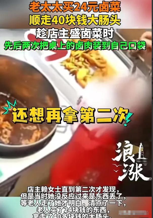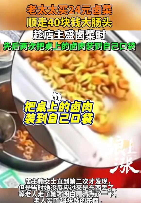 “丢人丢大发了!”江苏无锡,女子经营一家卤菜店,一日,她发现托盘里的卤大肠少了,她赶紧调取监控查看,这不看不知道一看吓一跳,一六七十岁老人,付款时,趁她不注意,先后两次偷偷将肥大肠装进自己的袋子里,动作行云流水,像拿自己家的一样顺畅。女子算了一下,老人共买了24元卤菜,拿走了40元的卤大肠。女子一气之下将视频发布到网上,让网友给评评理。网友:坏人都变老了! 赖女士的卤菜店,平日里光顾的老人不少,她总格外耐心,多添一勺卤汤、少算几毛钱是常事,却没料到自己的善意会被利用。 当天,店里依旧忙碌,卤香吸引着来往顾客,那位六七十岁的老人便是其中之一。 老人穿着普通、言行平常,在柜台挑选后,选了一份二十四元的卤味等待打包。 当时赖女士正忙着给其他顾客称重找零,注意力被分散,丝毫没留意老人的小动作。 监控清晰显示,老人趁着她转身的间隙,飞快地将托盘里肥嫩的大肠头偷塞进自己袋子,动作熟练得像做过无数次,毫无犹豫慌张。 这样的偷窃发生了两次,第一次赖女士完全没察觉,第二次虽隐约觉得不对,却没往偷窃上想,只当是自己看错了。 直到老人付完钱离开,赖女士整理柜台时,才发现满满一盘大肠头少了两大块。 她心里一紧,调取监控后,看到老人偷拿的画面时整个人都懵了。 清点后发现,被盗的大肠头价值四十元,比老人实际购买的卤菜价格还高。 卤菜生意毛利本就不高,房租水电食材成本压得她喘不过气,这四十元,就是她一天的生活费,是起早贪黑熬出来的辛苦钱。 赖女士又气又无奈,她不是心疼钱,而是觉得荒唐——六七十岁本该受人尊敬的年纪,却做出偷鸡摸狗的事。 她曾想过报警,可转念顾及老人年纪,担心报警对其影响太大,最终选择妥协,只当自己吃了个小亏。 后来和朋友闲聊提起此事,在朋友劝说下,她犹豫再三,还是把监控视频发了出去,提醒其他同行防范。 视频一经发布立刻炸锅,网友评论刷屏,分成了截然不同的两派。 一派网友夸赞赖女士善良,顾及老人颜面、给其留了台阶,还有人推测老人或许是喜欢卤味却舍不得买,一时糊涂犯错,不该过分苛责。 另一派则十分气愤,直言“不是坏人变少了,是坏人变老了”,认为不能因老人年纪大就纵容偷窃,四十元虽少,但偷窃本身就是违法的,不分年龄和金额。 不少做小生意的网友感同身受,分享自己被“顺手牵羊”的经历,有人被假装扫码付款,有人被趁攀谈偷拿东西,大家吐槽小本生意本就艰难,这样的小偷小摸实在让人无奈。 还有网友科普,很多人误以为七十岁以上老人犯法不用抓,其实这是误区,《治安管理处罚法》明确,偷窃私有财物可处五到十日拘留、五百元以下罚款,年龄大不是违法的“免罪金牌”。 一位七十四岁老人在菜市场扒窃市民钱包,涉案金额仅两百多元且有多次盗窃前科,最终被警方依法刑事拘留,即便年纪已高,仍要为自己的行为担责。 反观无锡这起事件,和当地老人被足浴店诱导消费三十多万、签下欠条的诈骗案比起来,确实是件小事。 赖女士的经历,是无数小商贩的缩影。 他们没有雄厚资金和稳定收入,靠着小店和手艺谋生,起早贪黑、省吃俭用,每一分钱都来之不易。 对他们而言,几十元的损失可能就是一天的房租或饭钱,看似不起眼的“顺手牵羊”,日积月累可能压垮生意、击碎生计希望。 那位偷大肠头的老人,或许有难处、或许只是贪小便宜,但偷窃终究不可取。 年纪大,从来不是放纵自己、侵犯他人权益的理由,更不是违法乱纪的“挡箭牌”。 我们尊重老年人,是尊重他们的年龄和阅历,而非错误行为; 我们倡导宽容,是宽容无心之失,而非明知故犯的偷窃。 此事之后,赖女士给店里装了高清摄像头,还和周边店主互通监控、共同防范,避免再遇类似情况。 她的做法既保护了自己的生意,也给其他小商贩提了醒——善良要有底线,宽容要有原则,学会保护自己才是经营小店的前提。 卤菜店大肠头被盗,看似微不足道,却像一面镜子,照出人性的复杂和社会存在的问题。 小本经营不易,每一份辛苦都值得尊重珍惜,不该被贪小便宜的行为践踏。