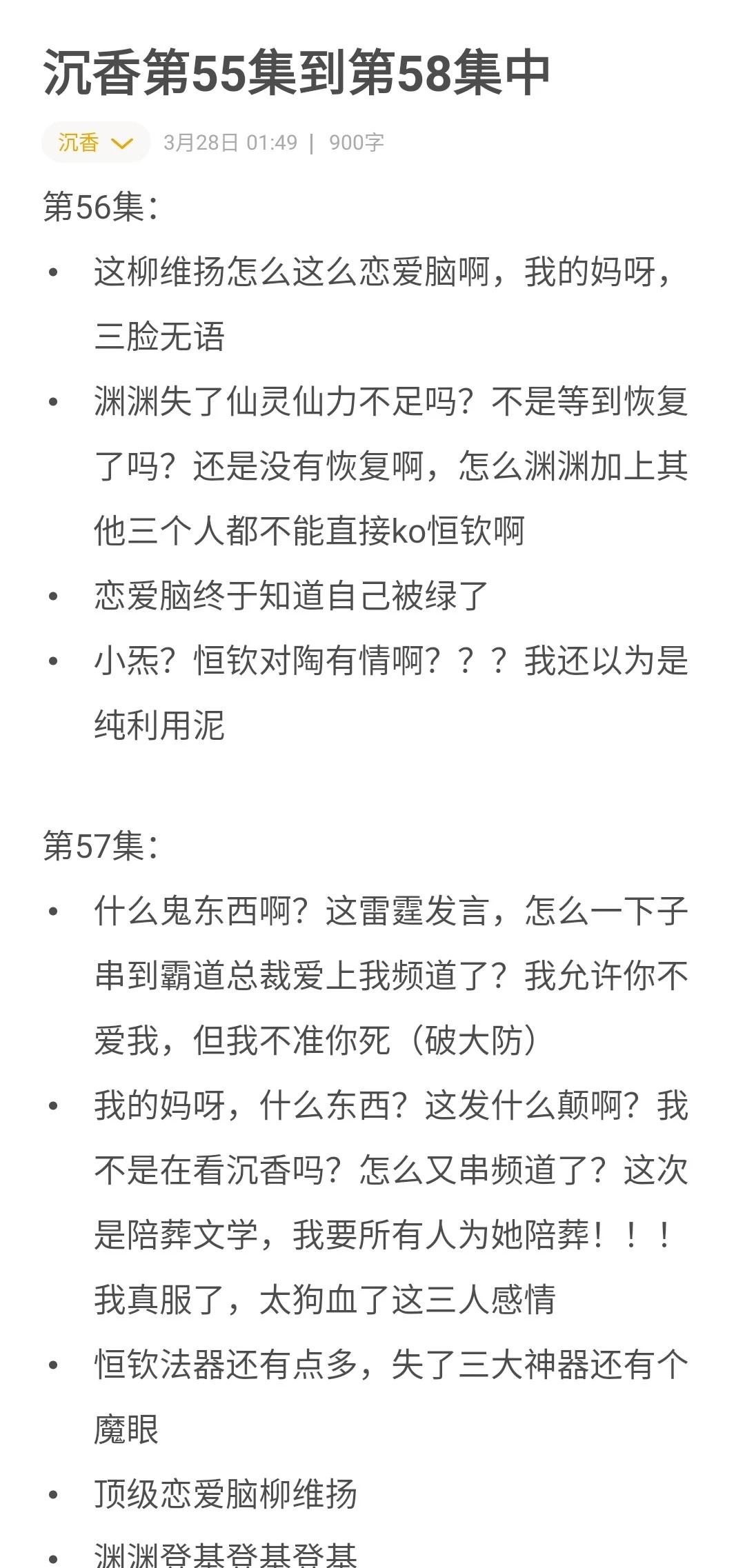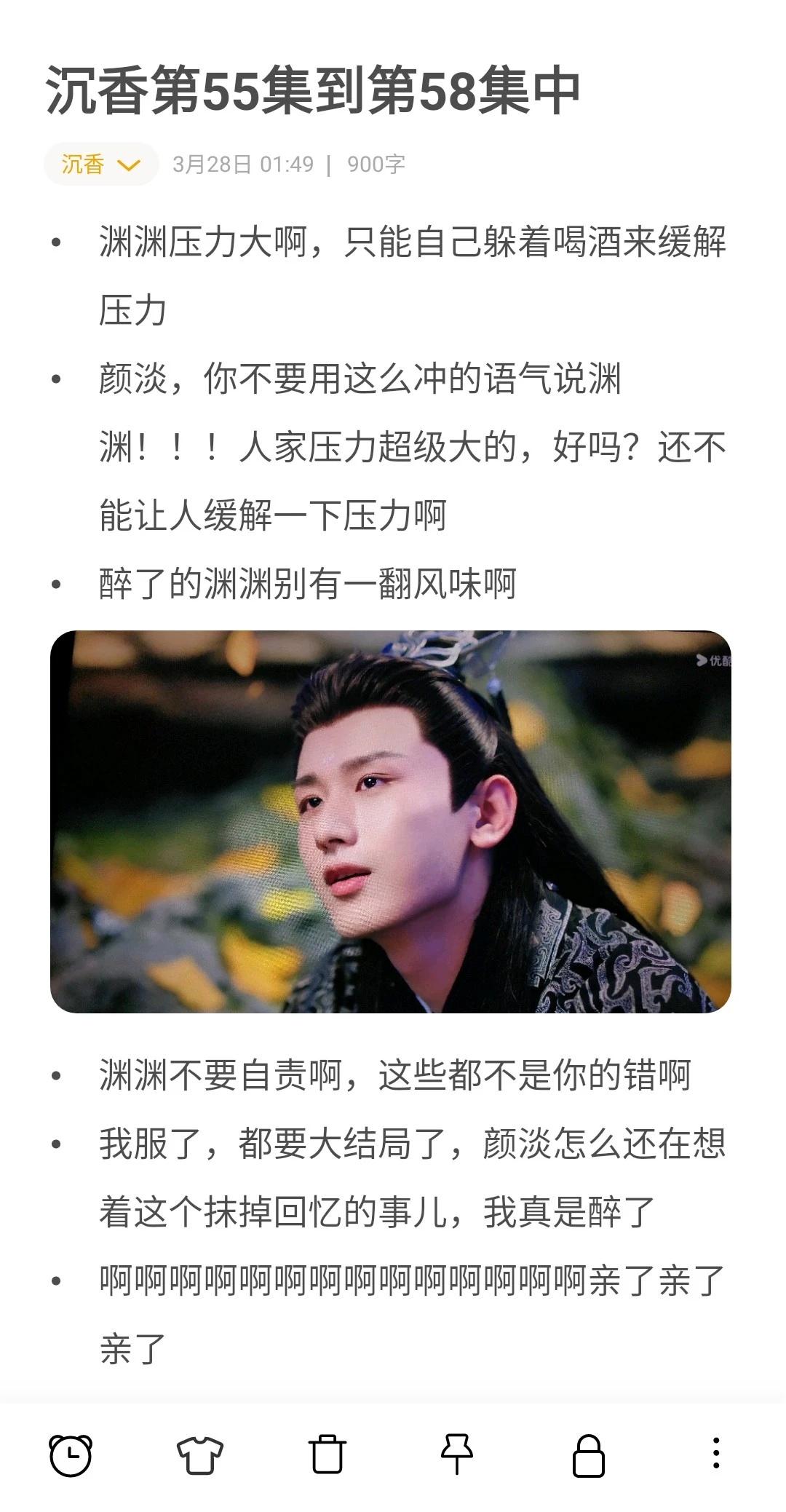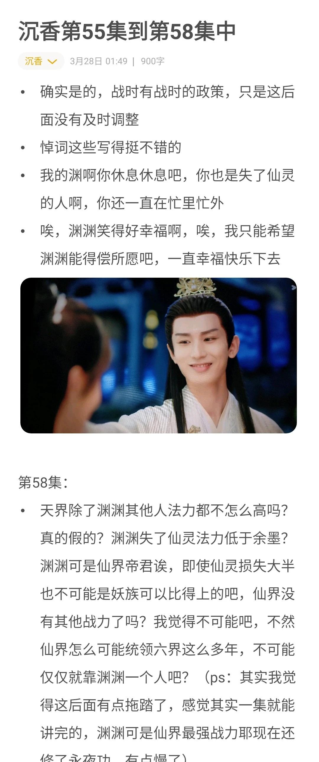 要大结局了 这几集,嗯,怎么说呢,前面埋的伏笔基本都回收的差不多了,这个挺好的,就是这剧情进展有点慢,还有邪神那三人的感情有点雷到我了,谁懂我看着感觉自己串台的感受 最后为渊渊打call,深色衣服的渊渊好带感啊,开头那个深蓝色渊渊,表情真的劲劲儿的,太帅了。最后结尾那个黑色衣服喝醉的渊渊也好好品,感觉乖乖的。还有那最后一幕穿红色衣服的渊渊真的很好看呐。我真服了,关键时候我的平板没电了,只能起来有时间再看了。 沉香如屑·沉香重华[eoi] 成毅应渊 分享一部最近看的电视剧 好看的电视剧