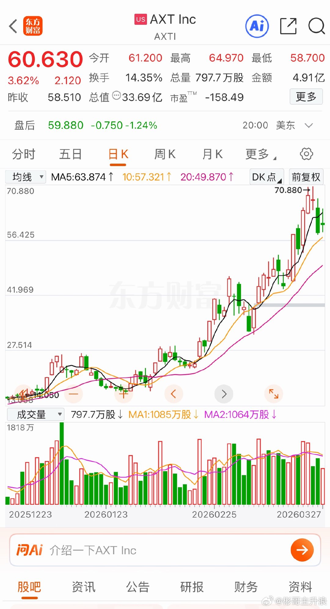 光芯片全面缺货,交期已排至2027年底。Lumentum、Coherent、博通等海外头部厂商2026全年产能被100%锁定,现货一货难求。近期价格全线大涨,100G EML涨幅40%,200G EML涨幅超50%。作为高端EML光芯片核心基材,磷化铟衬底供应瓶颈直接制约全产业链产能释放。美股磷化铟龙头AXTI逆市走强、屡创新高,公司为全球磷化铟衬底双寡头之一,市占率约36%。云南锗业:国内唯一具备磷化铟衬底大规模量产能力的企业。