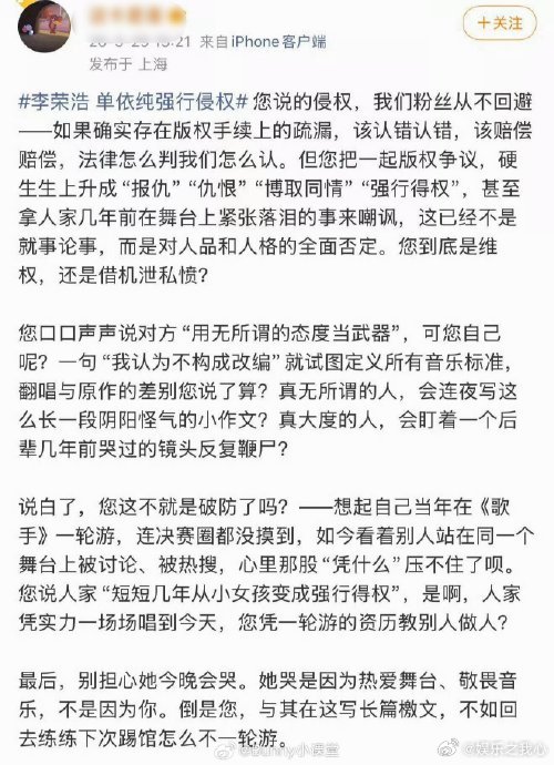 这件事情不仅仅是关于李荣浩和单依纯的,它也引发了我们对于整个音乐行业的思考。在追求商业利益的同时,我们是否还能坚守原创的底线?音乐创作者们又该如何在创新和避免侵权之间找到平衡?其实,音乐行业的发展离不开原创的力量。只有不断地推出新的作品,才能让这个行业保持活力。而对于侵权行为,我们应该坚决抵制,但也不能轻易地给别人扣上 “侵权” 的帽子,要尊重每一个创作者的努力。