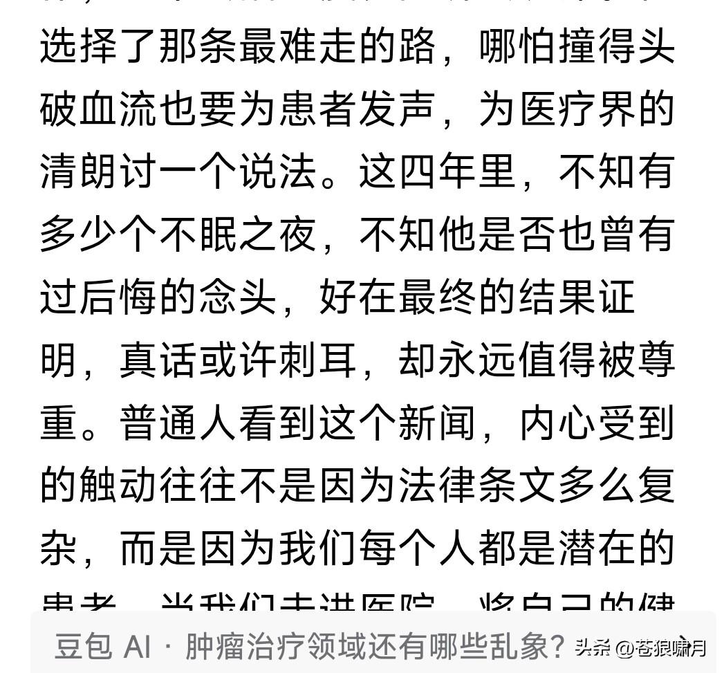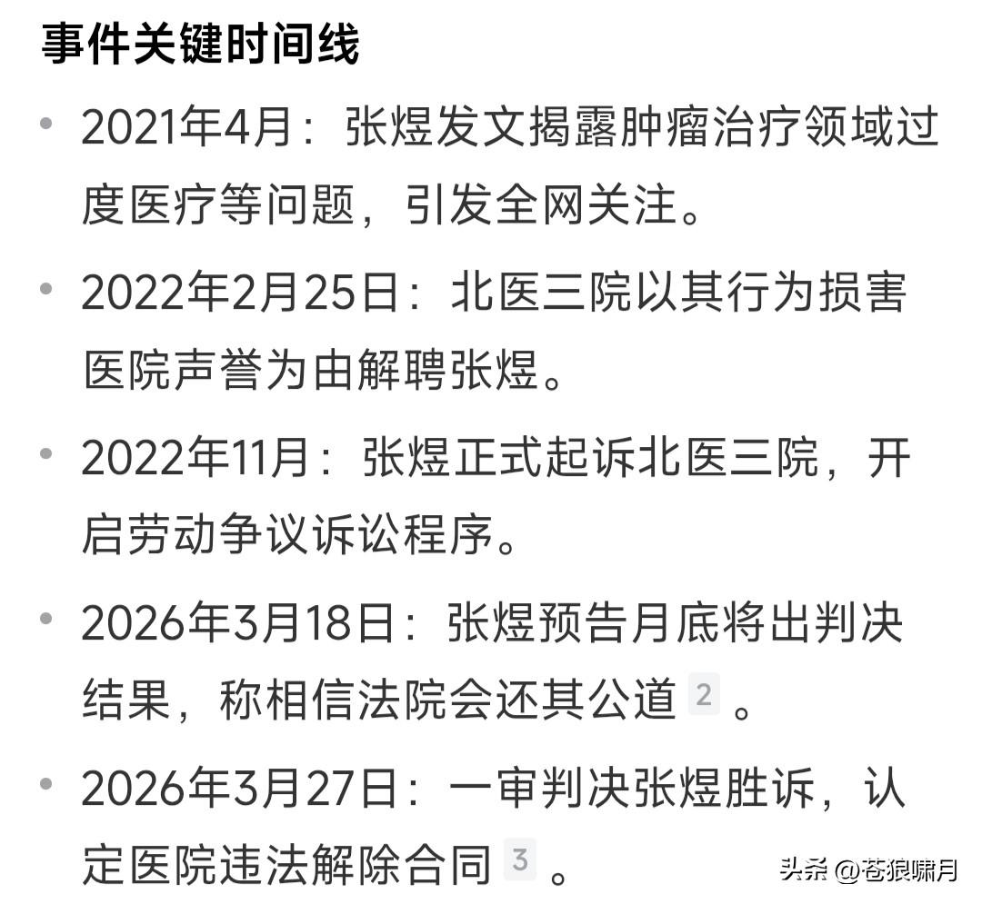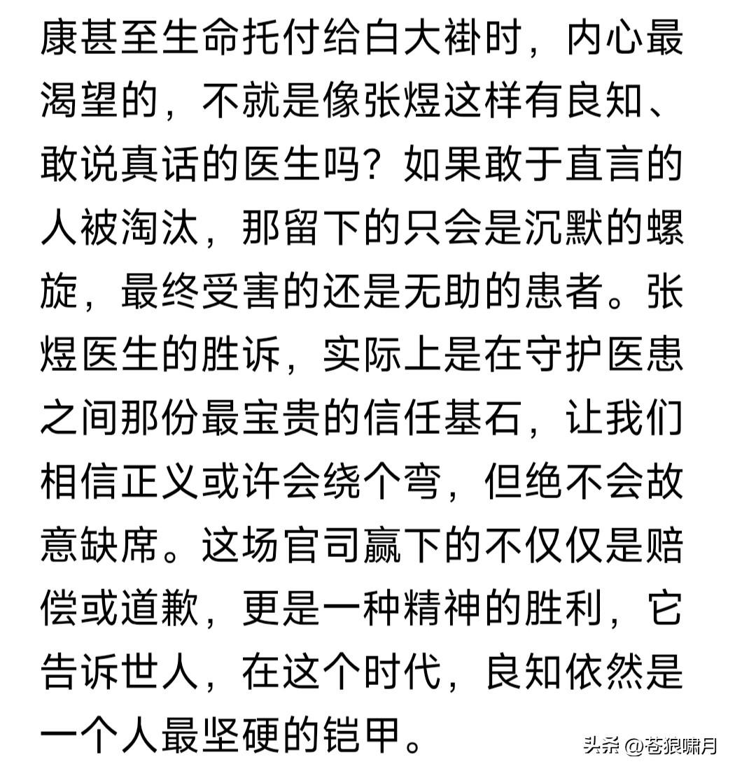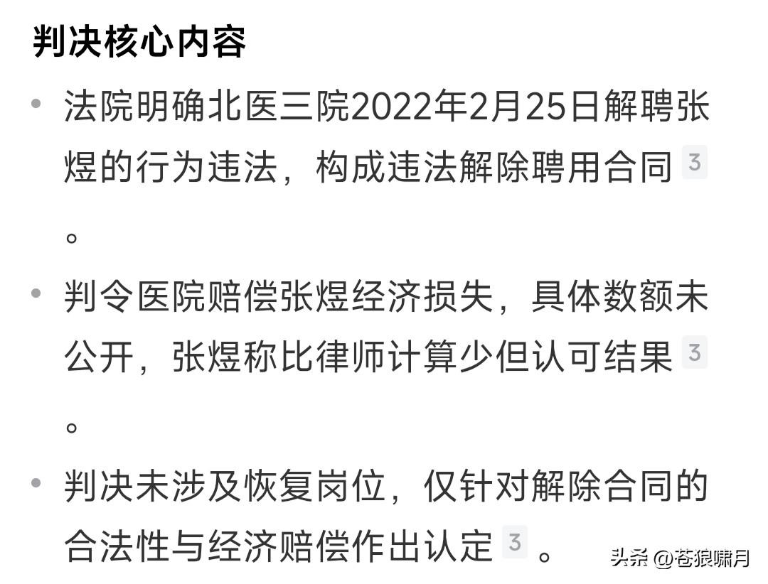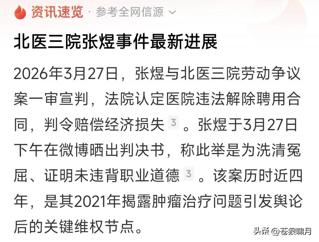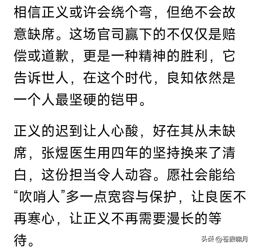 张煜医生胜诉,说明法治社会,正义必然得以伸张!他四年的申诉没有白跑,精神与物质损失得到些许补偿。 苍狼关心的是,既然法院判定医院开除张煜违法,并判令医院赔偿经济损失!关键是他还能回到医院工作吗? 张煜医生的遭遇,让人想到李文亮与兰越峰!想到现实生活中,说真话为何那么难?说真话者为何遭遇坎坷? 这是一个令人深思的问题!党中央的刊物叫“求是”,期望全社会都要落实好求是精神,为国家发展进步护航! …………