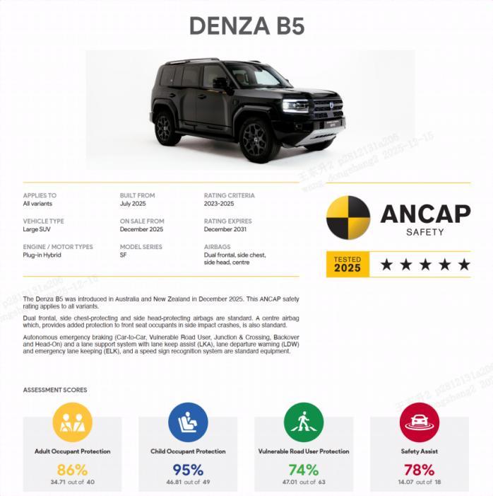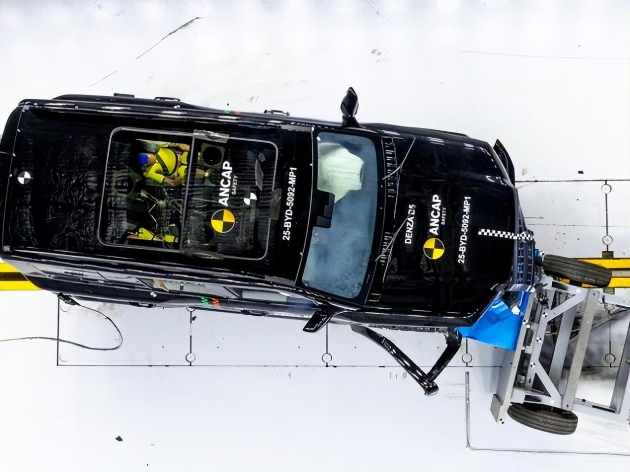 方程豹豹5 澳洲ANCAP碰撞测试被扣分? 方程豹豹5以腾势B5名字已经出口海外很多市场,没想到的是在澳洲市场却“惹了事”,在澳洲新车安全评鉴协会(ANCAP)的碰撞测试中,被扣了8分,原因却是“撞到别人时太硬”,在正面碰撞测试中罕见的把碰撞测试台车给撞飞出了测试轨道,而正常情况该测试的测试台车基本都是会停留在轨道上、并侵入测试车的保险杠中。 虽然因为对碰撞对象不友好扣了分,但是腾势B5依然获得了ANCAP五星评价,而且儿童保护得分率为95%,是ANCAP历年测试结果中排名最高的车型之一。 除此之外,B5对车内人员保护、行人保护以及安全辅助等测试项目均达到全球领先水平,展现了中国品牌的硬实力。