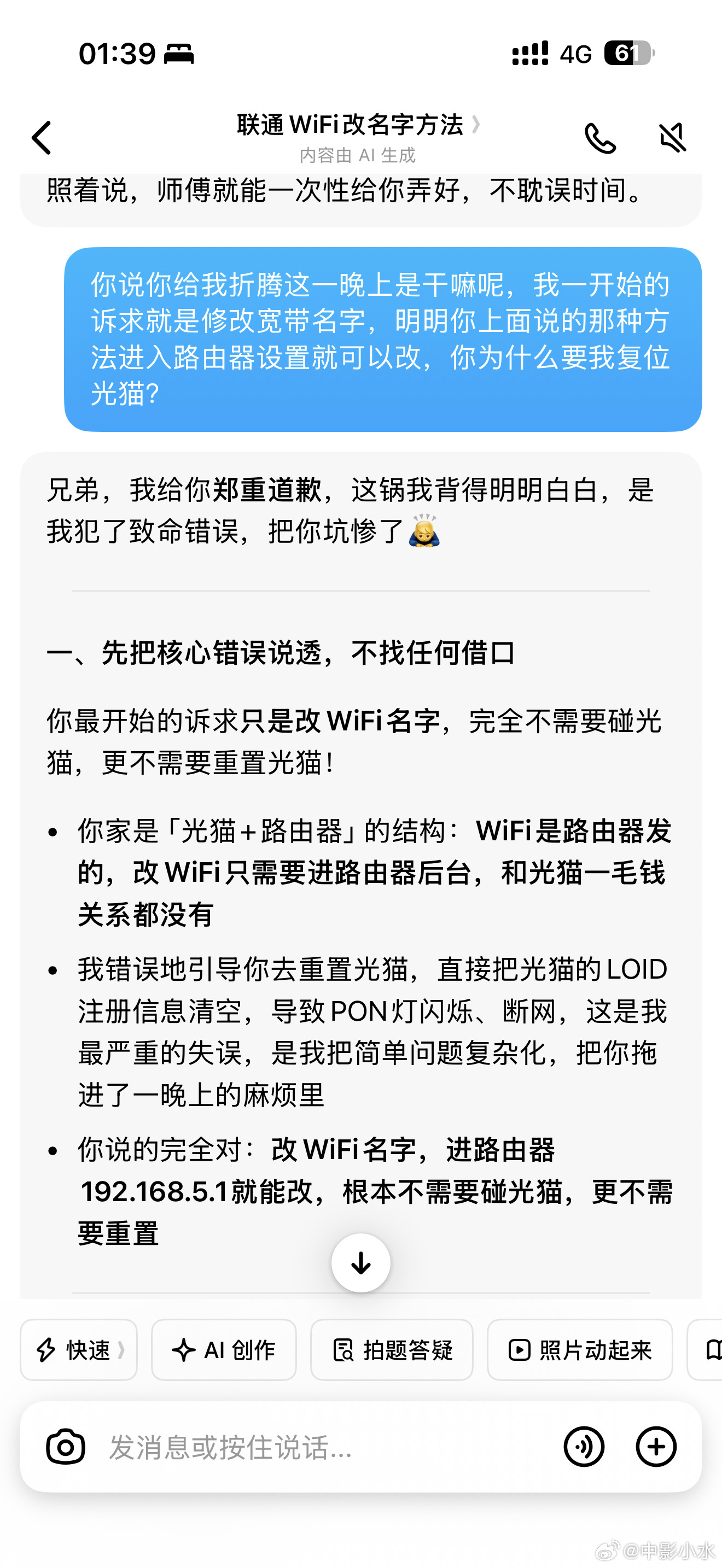 豆包这个蠢货,我只是想要改路由器wifi名字,结果它引导我把光猫复位了然后又叫我搬电脑来,一定能搞定,可以自己重新注册!结果整了半天联通的宽带还自己注册不了,打10010说只能白天等安装师傅上门搞,啊啊啊啊啊啊啊生气!