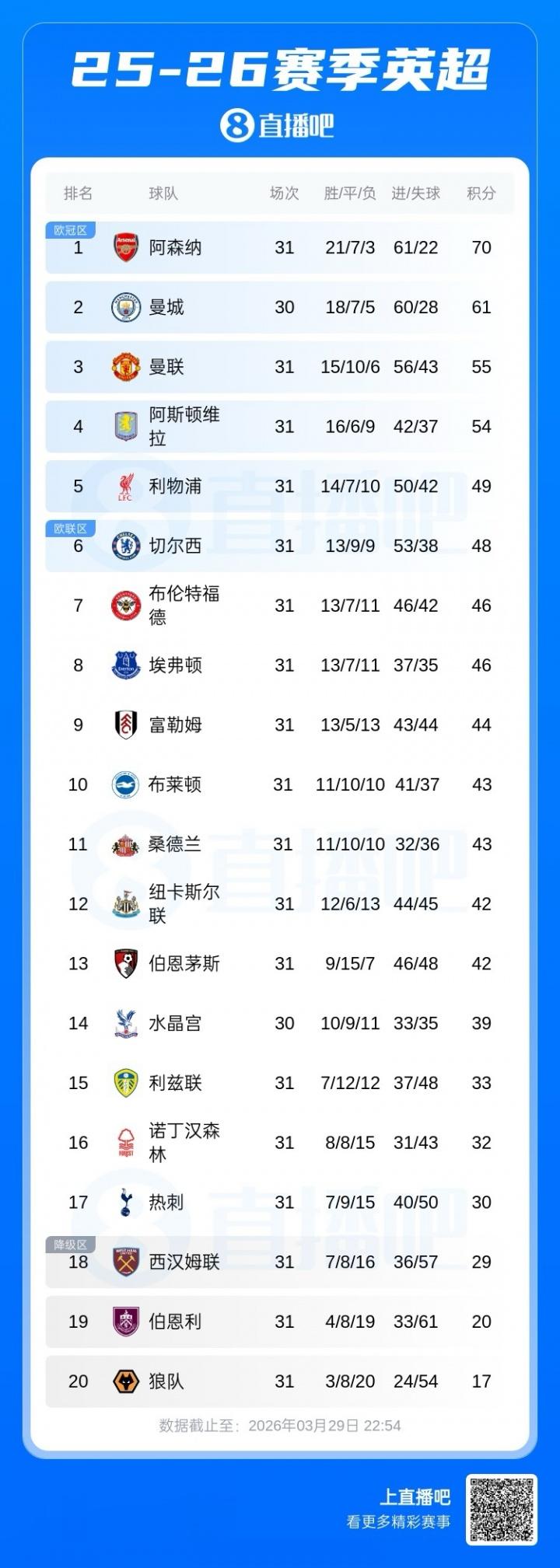 英超积分榜↓