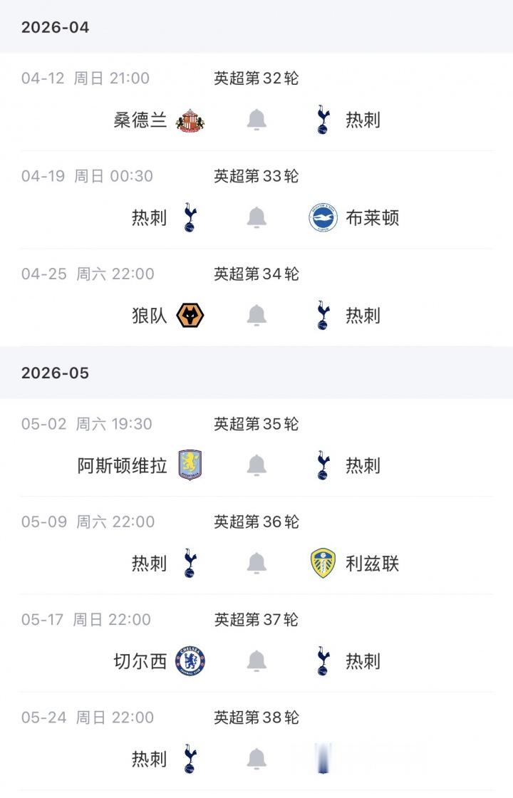热刺本赛季还剩下7轮英超,其中4个客场3个主场,他们将面对桑德兰、布莱顿、狼队、维拉、利兹联、切尔西以及埃弗顿。