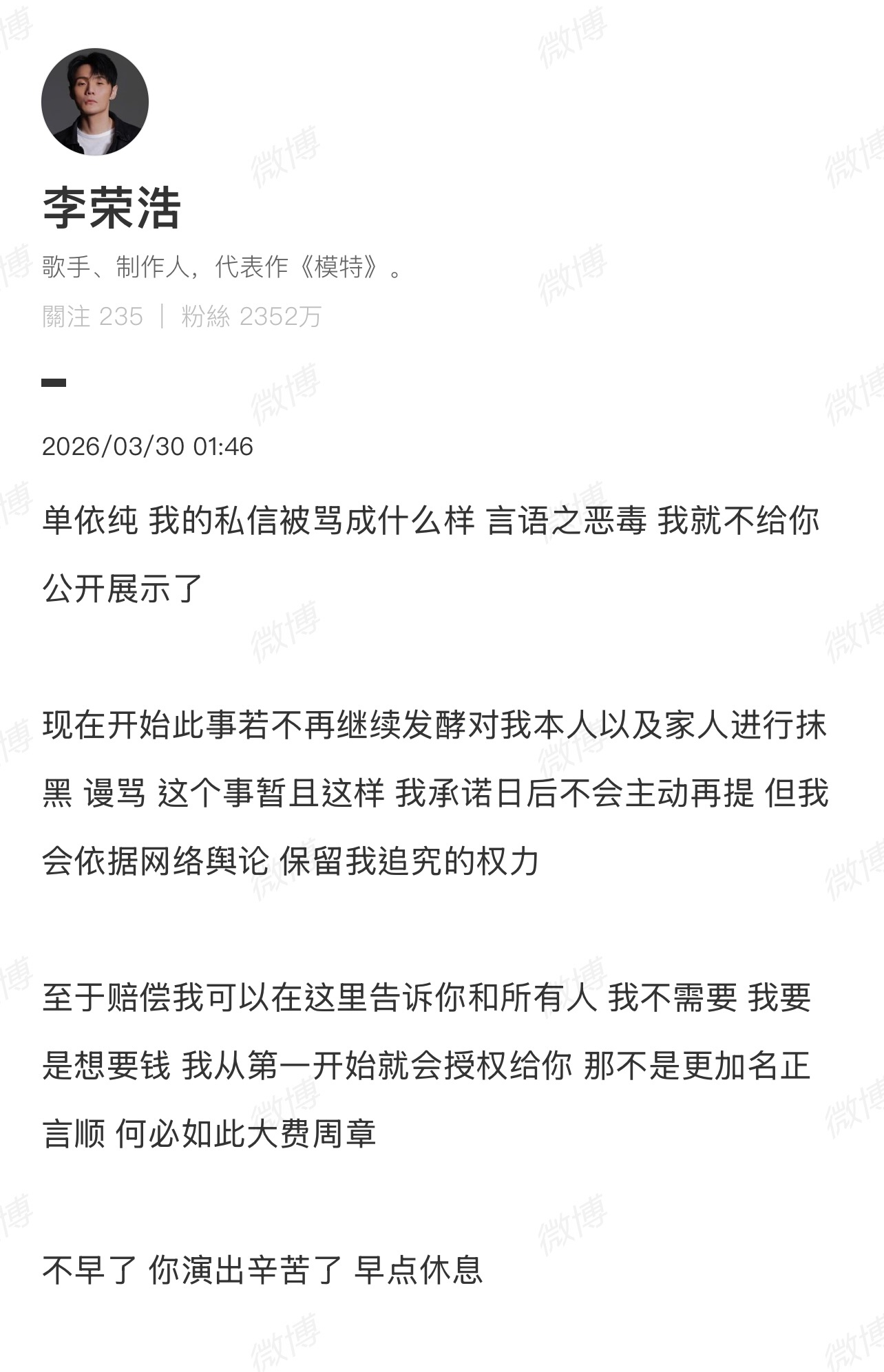 面对单依纯的长文,李荣浩还是心软了,此事高开低走告一段落!单依纯承担全额版权使用费及赔偿李荣浩说不需要赔偿