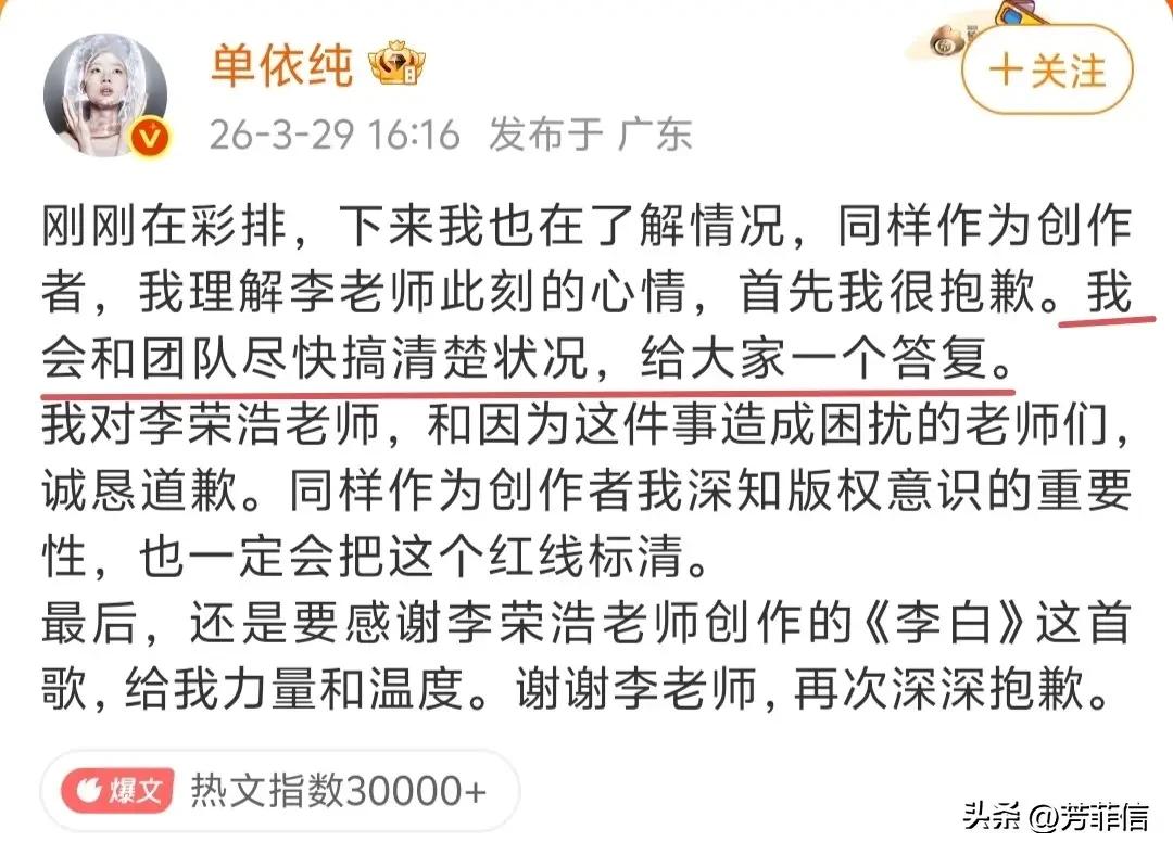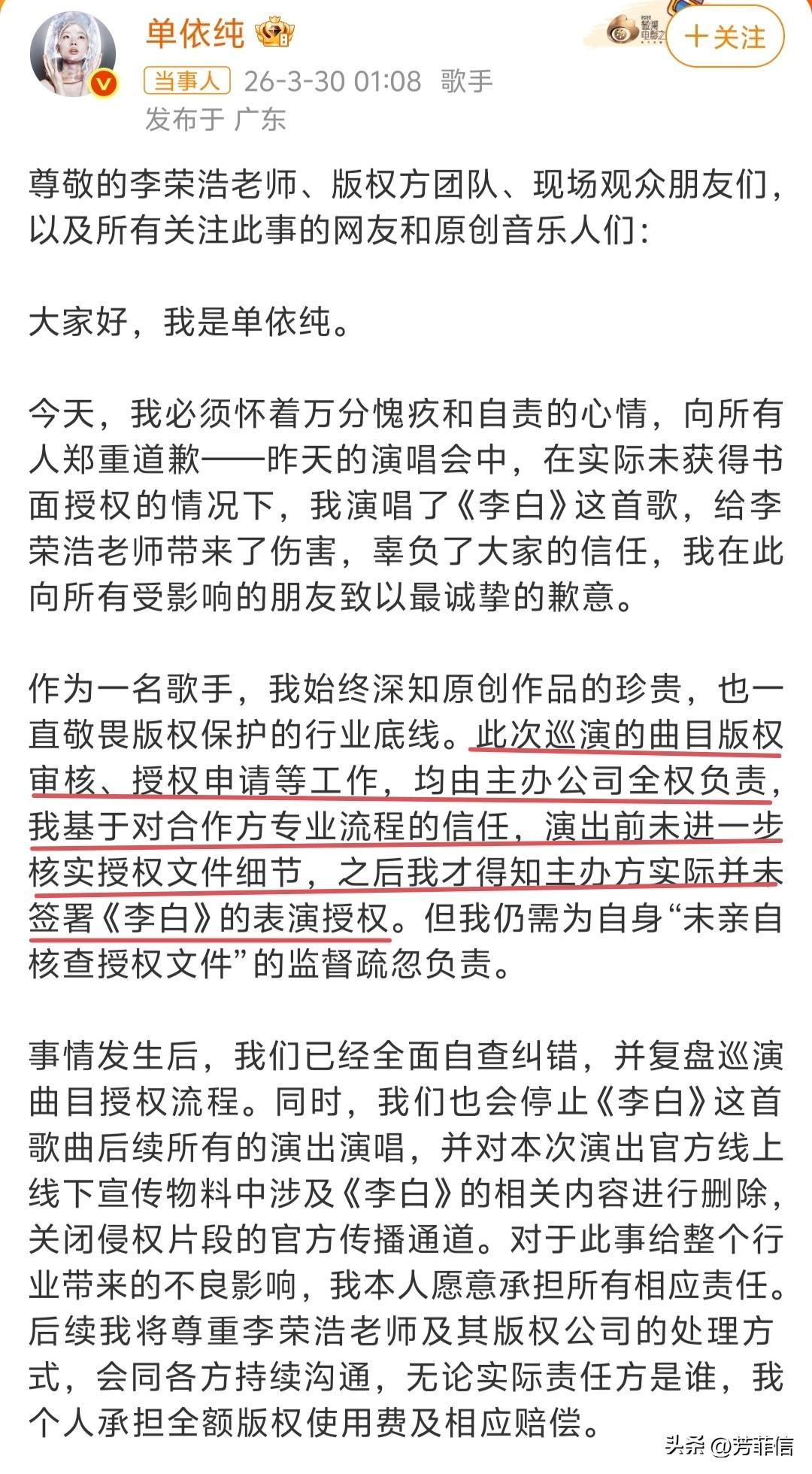 李荣浩还是太超前了,就这样一次又一次预判了单依纯的公关,好笑又尴尬。 3月29号,李荣浩发文控诉单依纯强行侵权,特意提到让她别说不知道甩锅给团队、别在演唱会落泪博取同情。 当舆论出圈,被推到风口浪尖上的单依纯是怎么处理的呢?以一副不知情模样回应,直言会找团队搞清状况,并在当晚的个人演唱会中潸然泪下。 演唱会结束后,再次发文强调她本人对授权问题不知情,由主办方全权负责。 没看错,李荣浩提前预判了单依纯的应对流程。 此情此景,一边佩服李荣浩,一边忍不住替单依纯尴尬。 想说李荣浩作为创作者,这个脑子确实没得说,人在气头上仍不失理智,又或者说,在娱乐圈打拼了这么多年,已经摸清了行业内的公关套路。 年少成名的单依纯,一路走来还是太顺了,当傲慢盖过才气、轻狂被滋养,是时候栽个跟头,这回惹到李荣浩算是踢到铁板了。