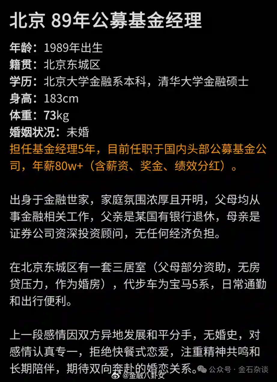 疑似头部公募基金经理相亲贴,年薪80万+,追求精神共鸣和长期陪伴