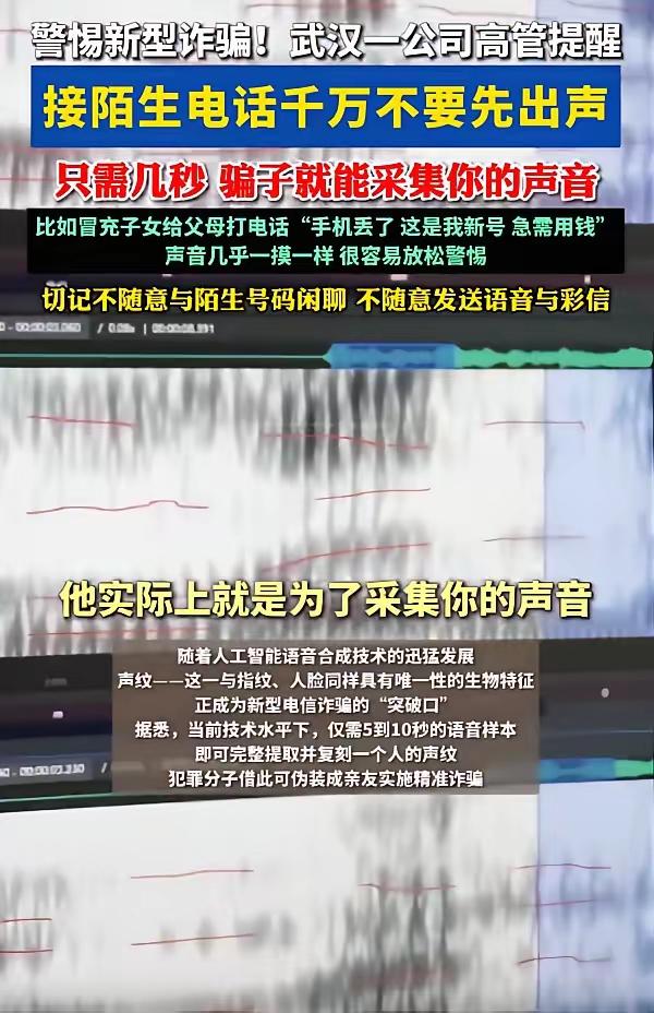 防不胜防!湖北武汉,一科技公司高管在接受采访时提醒,接到陌生电话时不要先出声,不要以为识别出对方是诈骗电话就放下戒备,因为我们的声音只需要几秒钟就可能被对方用AI采集下来,到时候受骗的可能就是家人了。 湖北武汉一位科技公司高管的公开提醒,瞬间戳中了无数人的神经——他郑重告诫,接陌生电话时千万别急着先开口,哪怕你已经凭经验认出这是个诈骗电话,也绝对不能放下戒心。 因为在你看不见的地方,AI系统正静静采集着你短短几秒的声音,用不了多久,它就会变成骗子侵害家人财产的“仿冒身份”。 这不是危言耸听,而是当下诈骗犯罪的真实升级。过去我们熟悉的那些骗术,比如冒充客服退款、公检法恐吓,依然存在,但它们已经不是最危险的。 如今真正让人防不胜防的,是AI声音克隆骗局,这个骗局的核心逻辑,从来都不是直接骗到接电话的你,而是通过你,去欺骗你的父母、爱人、孩子,利用亲情和信任实施精准诈骗。 他们会先用虚拟号码拨打电话,伪装成快递员核对尾号、运营商客服查询业务,甚至是街头调研人员询问简单情况。这些理由看似无关紧要,却能降低人的警惕性,一步步引导你开口说话。 哪怕你只是随口应了一声“嗯”“是”,或者报了自己的姓氏,这几秒钟的声音碎片就足够AI采集。 后台的黑产工具会快速提取你的声纹特征,重组你的音色、语调,甚至模仿你的语气和情绪,生成一段几乎能以假乱真的语音。 很多人挂了电话,还会暗自庆幸自己识破了骗局,却不知道自己已经留下了隐患,家人的安全防线正被悄悄攻破。 拿到克隆好的声音后,骗子会立刻锁定你的亲属,尤其是家中的长辈。 他们会用合成的你的声音,拨打父母、伴侣或孩子的电话,用急迫、哭腔的语气编造各种紧急场景。 比如“我出车祸了,急需医药费转账”“我被绑架了,要赎金不能报警”“我欠了钱被堵住了,马上转钱不然会被打”。 江苏苏州,市民王先生接到“弟弟”的电话,对方的声音、语气甚至平时的口头禅都和弟弟一模一样,哭着说开车撞了人,需要20万私了,还特意叮嘱王先生不要告诉父母,也不要用这个号码回拨。 王先生一时心急,未加核实就转了账,直到拨打弟弟通讯录里的老号码,才知道弟弟正在单位正常上班,所谓的“求助”全是AI克隆的骗局。 湖北黄石的独居老人,就曾遭遇AI克隆孙辈声音的骗局。 骗子通过非法渠道获取了老人和孙辈的信息,又采集了孙辈的几句声音样本,还原出相似的语气,以“孙儿打架要赔偿”“被带走要交保证金”为由,反复叮嘱老人别告诉家人,最终三位老人先后被骗走6万元积蓄。 普通人很难从技术层面对抗AI诈骗,但我们可以守住一道简单却有效的底线。 这道底线的核心,就是“不冲动转账,多重身份核实”。 不管是谁打来电话,只要涉及转账、借钱、救急,哪怕声音听起来和本人一模一样,也一定要立刻挂断电话,用自己手机里存的、最熟悉的号码回拨确认。 骗子只能模拟你的声音,却无法控制你的手机号,这是他们永远绕不过的坎。 同时,接到陌生电话时,不妨先不开口,让对方自报家门,一旦发现可疑就直接挂断; 用“嗯”“哦”这类简单的回应应付,尽量不清晰、完整地说话,减少声音样本的泄露。 除了电话场景,日常的网络使用也需要格外注意。 不要随意在社交平台、语音直播间、陌生网站留下自己的语音素材,这些公开的声音片段,很容易被骗子收集起来用于声音克隆。 AI诈骗的治理不能只盯着末端的行骗环节,必须把监管防线前移,管住非法提供声音合成的黑灰产,切断骗子获取技术工具的渠道,才能从根本上降低这类案件的发案率。 技术本是服务人类的工具,却被少数人用于作恶,这是人工智能普及过程中必须面对的治理考题。 但我们不必因此陷入恐慌,监管部门在不断完善规则,平台也在强化技术防护,而我们每个人,只要做好个人防护,就能筑起安全防线。