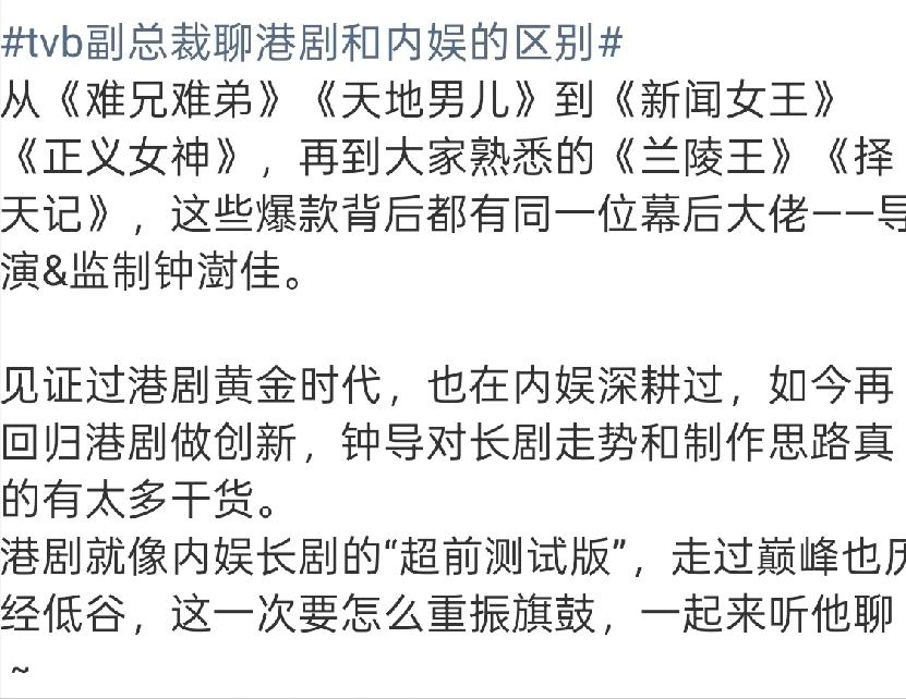 TVB副总裁,太敢说了! 3月28日,TVB副总裁钟澍佳连夜冲上热搜。他直接点出港剧和内娱长剧的差异:港剧胜在快节奏、真职场、演员专业;内娱输在拖沓悬浮、重排场轻内容。与其比体量,不如比真诚。 钟澍佳提到,港剧20分钟就能完成追凶、对峙、情感转折,随便切台都能接上剧情,这种高密度叙事,是港剧多年来的核心优势。 像《新闻女王》《正义女神》这类新港剧,早已摒弃传统家长里短的拖沓铺陈,转向强情节、快节奏的单元剧模式,每一集都有明确的冲突点和推进点,绝不浪费观众时间。 反观内娱不少长剧,动辄四五十集,却有大量注水情节,吃面、逛街、闲聊能拍好几集,主角谈恋爱磨磨蹭蹭十集,观众快进一集都不影响理解剧情,这种“慢”并非叙事深度,而是内容冗余。 内娱长剧往往为了凑集数、拉长播放周期,刻意稀释主线,把职场、悬疑等核心题材,硬生生变成了爱情戏的背景板,节奏拖沓到让观众失去耐心。 再说到职场真实感,这是港剧最拿得出手的底气,也是内娱长剧最明显的短板。 港剧深耕律政、医疗、新闻等垂直领域,每一部职场剧都力求专业落地,《新闻女王》剧组专门请前新闻主编当顾问,还原采编流程与主播伦理;《壹号皇庭》《鉴证实录》细化法庭辩论、法医取证细节,连角色的台词、动作都贴合行业真实状态。 港剧的职场戏,角色以专业能力立足,女性角色更是以职业身份为绝对主体,像《正义女神》里的法官言惠知,参考真实香港女法官形象,靠专业威严立住人设,而非依附情感关系。 而内娱不少职场剧,看似披着职场外衣,实则全是悬浮套路,职场细节漏洞百出,女记者穿超短裙采访、医生化着全妆做手术,把职场当成摆pose、谈恋爱的舞台,专业感荡然无存。 内娱职场剧常把角色的成长、成功绑定在爱情或人脉上,而非自身专业实力,这种“伪职场”,自然难以让观众产生共鸣。 演员的专业度与敬业精神,更是两地剧集差距的核心体现。钟澍佳直言,港剧演员把拍戏当“谋生”的正经工作,没有顶流架子,拍夜戏啃盒饭是常态,道具菜不敢随便吃,生怕浪费,配角也能把小角色演活,靠演技立足,没本事就会被市场淘汰。 香港演员普遍精通镜头语言,能自主调整走位、把控表演幅度,熟悉灯光对情绪的影响,片场里主动解决问题,黎耀祥就曾说“自己动手更可靠”。 而内娱部分演员,拿着高额片酬,却缺乏基本敬业精神,念台词靠数字、演戏靠替身,连基础走位都要导演提醒,团队过度维护艺人,反而降低了拍摄效率。 内娱长剧重流量轻演技,把演员的排场、话题度看得比专业能力重要,导致剧集里演员表演浮夸、人设空洞,即便有华丽的制作包装,也撑不起内容的内核。 当然,内娱长剧并非一无是处,它有更雄厚的资金、更先进的制作技术,4K画质、宏大场景、精致服化道,都是港剧难以比拟的优势。 但正如钟澍佳所说,剧集的核心终究是内容与真诚,而非体量与排场。港剧的优势,在于始终坚守内容为王,用紧凑的叙事、真实的细节、专业的表演打动观众; 内娱长剧若能摒弃注水套路、放下流量执念,回归创作初心,把资金和精力放在打磨剧本、提升演员专业度、还原真实质感上,未必不能超越港剧。 剧集创作从来不是比谁的集数更长、排场更大,而是比谁更懂观众、更尊重内容。钟澍佳的这番话,既是对港剧优势的肯定,也是对内娱长剧的警醒,与其在体量上内卷,不如在真诚上发力,唯有回归内容本身,才能让剧集真正打动人心。