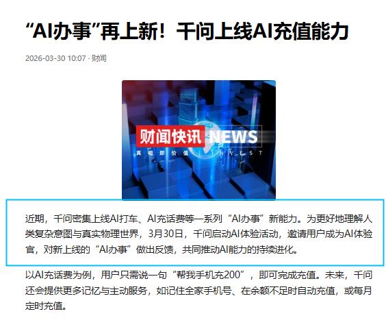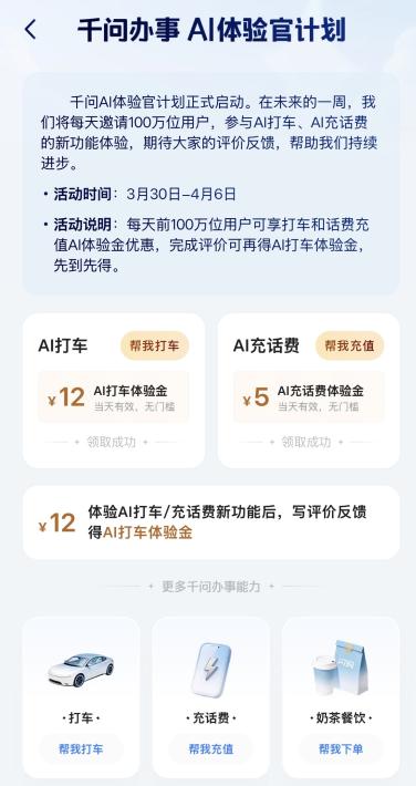 今天看到一则消息,彻底明白了千问“办事”二字的含义! 刚刚看到消息说,千问在连续上线了新的办事能力后,官宣启动AI体验活动,邀请用户对新上线的“AI办事”能力给出评价反馈。 为了让大家都参与进来,千问还针对用户推出了AI体验金,每天只要是前100万名登录千问的,都能领12元的AI打车体验金以及5元的AI充话费体验金。 如果对新上线的千问AI打车功能和AI充值功能作出评价反馈,还能再得2张12元的AI打车体验金。 从千问这个举动中,咱们算是彻底明白了何为“办事”?那必然是帮老百姓、帮普通用户办事。那么如何才能办到大家心里呢?那就得听用户的意见。 千问算是做到了这一点了,而且很明显千问也想通过用户的意见来持续完善其AI办事能力。 这无疑是一个好事,因为对于普通人来说,这真的可以帮我们的大忙。 比如说千问刚上线的AI充值和AI打车两个新功能,就非常的给力。咱们想要给手机充话费,再也不需要一顿捣鼓了,只需要对着千问说一句“帮我手机充200元话费”,很快你就会收到充值成功的信息。 办事变得更加方便了,复杂的操作浓缩成了一句话的指令,剩下的全部由AI去理解,然后去执行,省心太多了,门槛也降低了很多,之前很多老年人干不了的事,现在这扇大门也对他们开放了。 其实,科技的进步和强大从来就不是看数据有多牛,而是看能不能给我们真正的帮助,这一点千问无疑做到了!