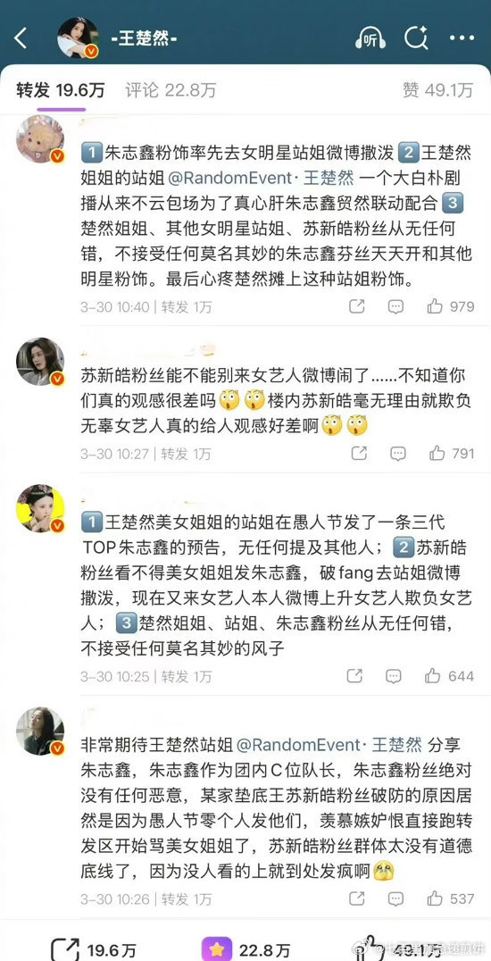 王楚然站姐发了愚人节的朱志鑫预告,在王楚然本人微博转发区苏新皓粉丝和朱志鑫粉丝正在battle