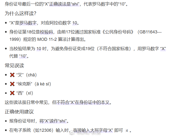 身份证号的X到底咋读 身份证号最后一位的X”正确读法是“shí”,代表罗马数字