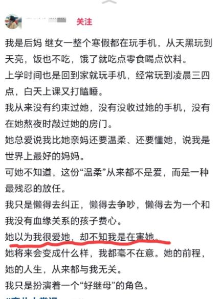 安徽一后妈放任整个寒假让继女玩手机,从天黑玩到天亮,饿了就吃零食喝饮料,孩子说“我是世界上最好的妈妈”。“她以为我很爱她,却不知我在害她。” 这位后妈和继女相处的时间不算太长,平时就没怎么给孩子立过规矩,更不会像亲生父母那样,念叨着让孩子早睡早起、按时写作业。 孩子的亲妈不在身边,跟着爸爸和后妈一起生活,从小到大没怎么体会过“没人管”的日子,直到这个寒假,后妈彻底放开了所有约束,让她过上了“随心所欲”的生活。 寒假一开始,孩子就跟后妈说想玩手机,本来以为会被拒绝,毕竟以前就算玩,也会被限制时间。可没想到,后妈连犹豫都没犹豫,直接点头答应了。 还跟孩子说“你想玩就玩,不用跟我说”。从那以后,手机就成了孩子形影不离的伙伴,彻底占据了她的整个寒假。 每天傍晚天刚黑,孩子就抱着手机窝在沙发上,要么刷短视频、要么玩小游戏,有时候还会跟同学聊到深夜,一直玩到第二天凌晨天快亮才肯放下。 整夜抱着手机不撒手,眼睛盯着屏幕一动不动,有时候困得揉眼睛、打哈欠,也舍不得关掉手机,顶多眯个十几分钟,醒了继续玩。 久而久之,孩子的作息彻底乱了套,白天睡得昏昏沉沉,不管家里怎么吵,都醒不过来,有时候中午十一二点才起床,洗漱完连早饭都不吃,直接拿起手机继续玩,一天下来,除了睡觉就是玩手机,连家门都没出过几次。 这种昼夜颠倒的状态,对正处于发育阶段的孩子来说,伤害不小,要知道青少年大脑还在关键发育期,熬夜会让海马体活跃度下降,长期下来会影响记忆力,还会导致情绪波动变大。 除了作息混乱,孩子的饮食也完全没规律。饿了的时候,她不会主动找正餐吃,后妈也从来不会主动做饭给她吃,只是提前在茶几上、沙发边备好满满一堆零食和饮料,薯片、饼干、辣条、巧克力应有尽有,还有各种碳酸饮料和甜饮,都是孩子平时喜欢吃的。 孩子想吃东西了,随手就能拿到,饿了就啃几片薯片、吃几块饼干,渴了就拧开碳酸饮料猛灌几口,整个寒假下来,几乎没吃过一顿正经的米饭和蔬菜。 她不知道的是,这些含糖饮料和零食对身体的伤害很大,一罐330毫升的可乐就含有约35克蔗糖,长期喝不仅容易长胖,还会增加糖尿病的风险,零食吃多了也会破坏肠道菌群,降低免疫力。 整个寒假,后妈从来没有唠叨过孩子一句,不催促她写寒假作业,不强迫她早睡早起,也不要求她帮忙做一点家务,哪怕看到孩子整天抱着手机、不吃饭不运动,也从不出言制止。 孩子身边的同学,寒假里要么被父母催着上补习班、写作业,要么被要求规律作息、帮忙做家务,每天都有各种约束,对比之下,这个孩子过得简直像“小公主”一样,毫无压力。 孩子也常常跟身边的小伙伴炫耀,说自己的后妈特别好,从来不会管着自己,想玩多久手机就玩多久,想吃什么就吃什么,不用遵守任何规矩。 有一次,孩子抱着后妈的胳膊,一脸认真地说:“妈妈,你真是世界上最好的妈妈,比任何人都疼我。” 面对孩子的夸奖,后妈没有欣慰,反而在私下里跟身边人感慨:“她以为我很爱她,却不知我在害她。”其实这位后妈心里清楚,自己的放任不是疼爱,只是懒得去管教。 她知道长期熬夜玩手机、吃零食喝饮料,对孩子的身体和学习都会有很大影响,可她始终没有主动去约束孩子,也没有想过要引导孩子养成良好的习惯。 据悉,现在重组家庭越来越多,不少继父母都会面临这样的困境,管多了怕被当成多管闲事,怕孩子不接纳自己,不管又觉得不负责任。 最后就选择了放任自流,这种冷淡的处理方式,往往比直接责骂更伤人,因为孩子根本意识不到自己的问题所在,还会把这种放任当成是偏爱。 而且现在未成年人互联网普及率很高,手机成瘾的情况越来越普遍,像这个孩子这样,日均玩手机超过4小时,还昼夜颠倒,很容易出现手机依赖。 不仅会导致视力下降、颈椎异常,还会削弱逻辑思维能力,影响现实社交能力,这些伤害都是潜移默化、难以逆转的。 不管是亲生父母,还是重组家庭里的继父母,都肩负着教育孩子的责任,不能因为怕麻烦、怕得罪孩子,就放弃管教,用放任不管的方式敷衍了事。 真正合格的长辈,不会只给孩子毫无约束的自由,而是会用正确的方式引导孩子成长,让孩子养成自律的品性,走上正轨。