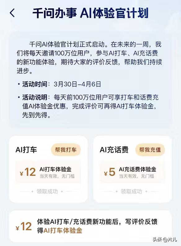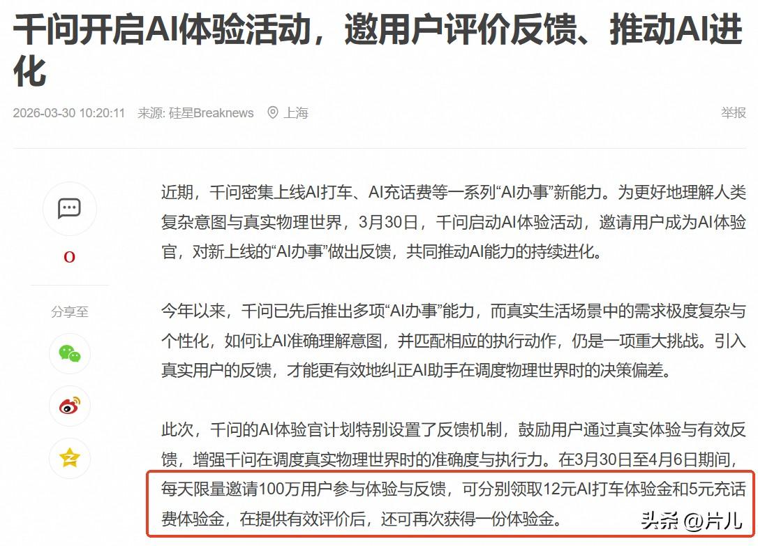 三月即将结束,国内再次传来好消息! 继春节期间千问推出AI订餐、订电影票之后,在三月底,千问又悄悄升级了办事能力,AI打车、AI充值两大功能正式上线,一句话就能搞定打车、充话费,彻底解决了普通人的日常烦恼,也让我们看到了国内AI应用的真正实力! 这波更新,真的太懂普通人的需求了。千问的核心方向从来不是搞花里胡哨的噱头,而是让AI从“会聊天”变成“能办事”,让每一个人都能享受到科技带来的便利。 说实话,咱们普通人每天都要面对充话费、打车这些刚需事,传统方式真的太繁琐——要打开好几个APP,手动输手机号、输地址,尤其是家里的老人,操作起来特别费劲。而千问的AI打车和AI充值,完美解决了这个难题。AI充值只要说一句指令,不用多余操作,未来还能记住全家手机号,实现自动充值、定时充值;AI打车能记住家庭和公司地址,一句“打车回家”就能叫车,不管是个性化需求,还是复杂的预约,都能精准满足,既适合年轻人的快节奏生活,老人也能轻松上手。 为了推动自身AI能力的持续进化,也为了让更多用户积极反馈,千问特意推出了丰厚的体验金活动,诚意满满。3月30日到4月6日期间,每天前100万登录千问的用户,直接就能领12元AI打车体验金和5元充话费体验金,体验完提交真实评价反馈,还能再领2张12元AI打车体验金! 12块钱的打车体验金,很多人早上通勤都够用了,每天领一张,一周的打车钱都能省下来。这不仅是千问的福利回馈,更是科技普惠的体现! 未来,相信千问还会推出更多实用功能,让咱们普通人真正享受到科技发展的红利。