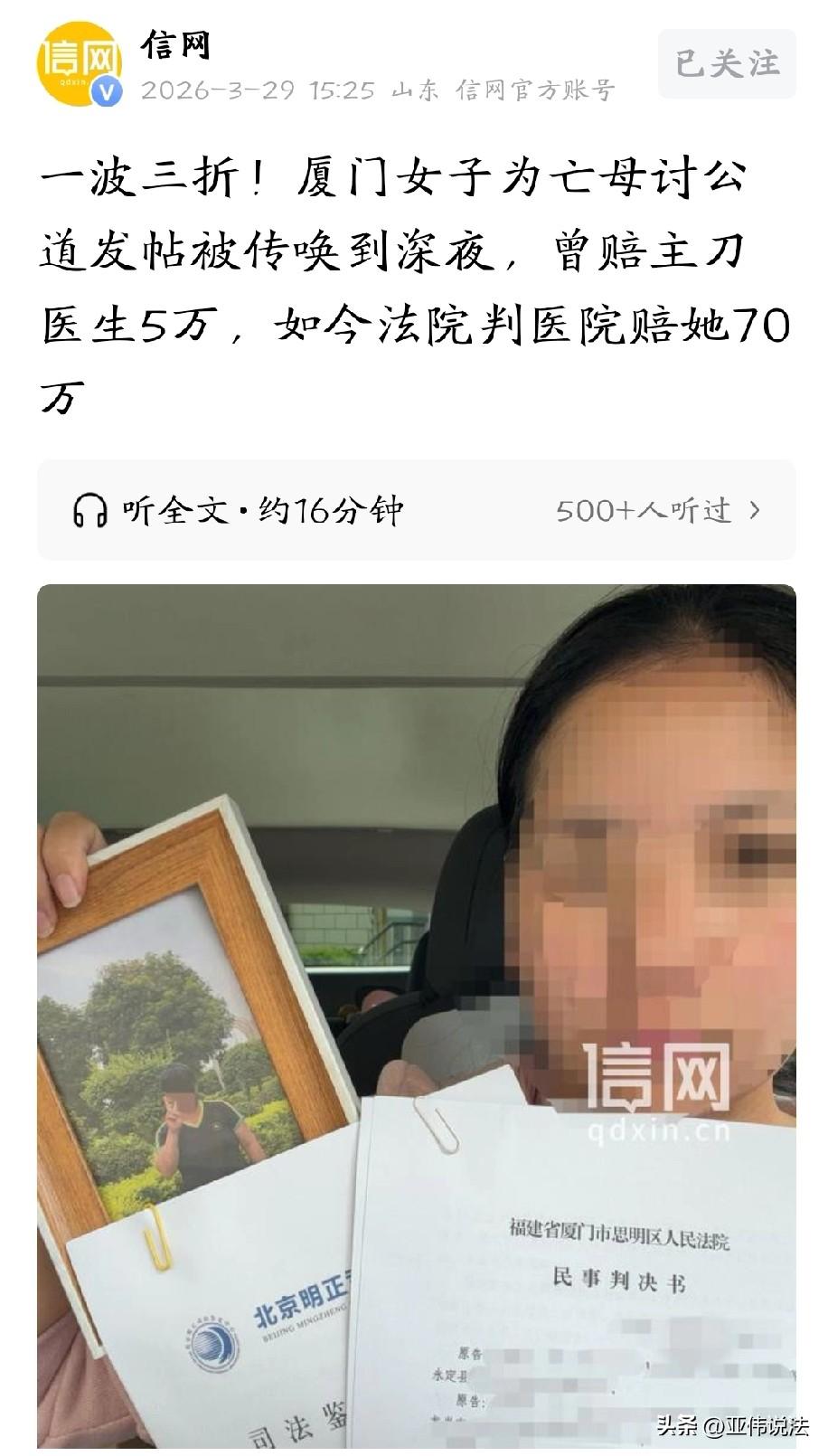 福建厦门,女子母亲在医院做完胆结石手术,术后全身黄疸未退,医生便催她出院,谁知,一个多月后母亲便去世了。女子悲痛之余满心疑惑,经过调查,她竟发现医院私自将微创手术变成了开腹大手术,而且,主刀医生以前就出过重大医疗事故。女子怒了,一气之下告上法庭。打官司期间,她在网上发帖质疑主刀医生,却以涉嫌诽谤被警方带走,她向医生道歉并赔偿了5万元。犯错的人逍遥法外,自己却因此患上抑郁,几乎崩溃。 刘女士怎么都想不到,一场微创的胆结石手术,竟然让自己和母亲永别。 2024年,刘女士的妈妈谌女士,那年才50多岁,因为胆管结石住进了医院。 当时她身体情况不太好,血小板低,而且以前做过好几次手术,肚子里有粘连,肝功能也不好,她跟医生提过,能不能先保守治疗。 可主治医生李某坚持要做手术,还跟家属说这就是个微创小手术,肚子上打四个洞,睡一觉就好了,这种手术他们做过几千例,让家属放心。 刘女士见李某如此有信心,便同意了,但这场原本微创的小手术竟然一做就是7个小时。 原来,手术中李某发现刘女士母亲肚子里粘连得厉害,微创根本做不了,临时改成了开腹大手术。 但这些事,家属都是术后才知道的。 李医生出来说手术非常成功,刘女士当时还特别高兴,感激得不行,也就没多问为什么微创变成了开腹。 可术后母亲的情况急转直下,全身黄疸不退,李医生却反复催着出院。 刘女士微信询问∶黄疸没退完能出院吗?得到的回复是∶可以出院复查,再住意义不大。 万万没想到,谌女士出院5天后,就因伤口大出血紧急送医,几天后陷入肝昏迷,此时总胆红素已超标30多倍。 情况危急,刘女士紧急转院,但仍无力回天。 11月5日,母亲因慢加亚急性肝衰竭离世,连即将出生的外孙都没能见上一面。 刘女士怎么也想不通:一个胆结石手术,怎么就把人治没了? 当时她已经怀孕9个多月,连丧母之痛都没来得及消化,就挺着大肚子开始疯狂查资料,翻医学文献,还跟全国各地的医生交流。 越查越觉得不对劲,母亲的诊疗过程,竟然每一步都有问题。比如∶医院手术时机值得商榷,黄疸未查明原因就让出院,出院即死亡,太不正常了。 2025年,刘女士将医院告上法庭,法院进行了专业司法鉴定,结果坐实了医院的过错。 首先,术前检查疏漏,未做磁共振或内镜超声评估胆管情况。其次,手术方式选择错误,明知患者腹腔粘连严重仍选创伤大的开腹手术,未优先考虑引流。 而且,术中临时改开腹未告知家属签字,出院时肝功能严重异常也未书面告知风险。 《民法典》第一千二百一十九条规定∶医务人员在诊疗活动中应当向患者说明病情和医疗措施。不能或者不宜向患者说明的,应当向患者的近亲属说明,并取得其明确同意。医务人员未尽到前款义务,造成患者损害的,医疗机构应当承担赔偿责任。 这些行为严重违反告知义务与诊疗规范,侵害患者知情同意权。 所以法院认为,医院过错与谌女士死亡存在因果关系,需承担次要责任。 更让刘女士崩溃的是,她偶然发现主刀医生李某并非首次出事。 2018年,李某曾因手术未告知替代方案、备血不足,导致患者术中大出血休克死亡,被认定为一级甲等医疗事故,本人被暂停执业8个月,之后却又重回医院任职。 他催母亲出院,是不是怕人在他医院出事?这个念头让刘女士浑身发冷,而从始至终,李某没说过一句道歉。 2026年1月,悲愤的刘女士以李某的视角,在网上发了一篇“自白帖”,虚构了“为效益让患者上台”“没取完结石就收尾”等内容。 她以为没写全名、浏览量只有2700多次不会有事。 可2月3日,警察突然上门,称李某某报警控告她诽谤,帖子总浏览量已超5000次,达到刑事案件立案标准。 一边是可能留下案底的拘留风险,一边是家里嗷嗷待哺的孩子,刘女士崩溃了。 当天深夜,她在派出所签下调解协议,向李某某道歉,赔偿5万元精神损失费,删除所有维权帖文。 这场风波后,她患上重度抑郁,失眠、掉发、胸闷成了常态,医生要求24小时专人看护严防自杀。 2026年3月17日,法院一审判决医院承担30%责任,赔偿706401.28元。 此时刘女士得知,李某某已从医院调走,去向不明。 对于此事,卫健委也介入调查,确认医院存在医嘱错误、病历不规范等问题,针对术中变更手术未告知一事正式立案,待医疗事故鉴定结果出来后将依规处罚。 但却刘女士表示,民事赔偿、行政处分都不够,她必须要一句迟来的道歉,让母亲走的明明白白。