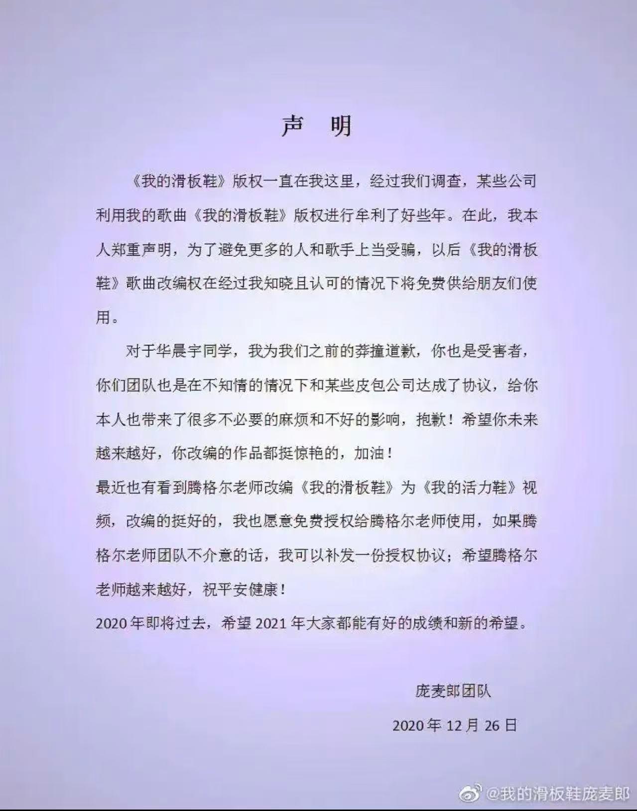 庞麦郎艾特华晨宇,工作室八字回应太绝了! 3月30号半夜,庞麦郎发了一条消息,还专门@华晨宇,一下子就把好多年前《我的滑板鞋》这首歌的旧事儿,重新拉到大家眼前了。 这事得从2016年说起,当时华晨宇参加一个唱歌节目,把庞麦郎唱的《我的滑板鞋》重新改了调子,变得特别好听。 他还特意写明,原来的歌是庞麦郎写的,改完的歌一下子就火了,好多人都喜欢听。本来这是件挺好的事,没想到后来闹了不少矛盾。 2019年年底,庞麦郎突然说,华晨宇上台商演唱这首歌,没经过他同意,是不对的。结果华晨宇的工作室马上拿出证明,说早就拿到合法的许可了,做事完全合规,没一点问题。 更有意思的是,2020年的时候,庞麦郎还专门道歉了,说这首歌的版权不在自己手里,华晨宇是无辜的,还夸华晨宇改得特别好听。 大家都以为这事早就翻篇,没人再提了,可没想到庞麦郎现在又把这件事挖出来说。面对他突然的点名,华晨宇的工作室中午只说了八个字:“冷饭又炒,不再回应!”还把之前庞麦郎的道歉证明放了出来,态度特别干脆。 网友们也都议论纷纷,说庞麦郎这几年唱歌演出,没什么人去看,现在翻旧事儿,到底是真的要维权,还是想让大家多关注他呀?再看华晨宇,早就靠自己的唱歌实力变得很厉害,根本不需要靠这种事博眼球。 其实这件事早就有结果了,华晨宇改编、演唱都是合法的,问题是庞麦郎和版权公司之间的矛盾,华晨宇只是被无辜连累了。不管是哪个歌手,好好做音乐、唱好歌才是最该做的,总翻已经解决的旧事儿,真的没什么意义。
