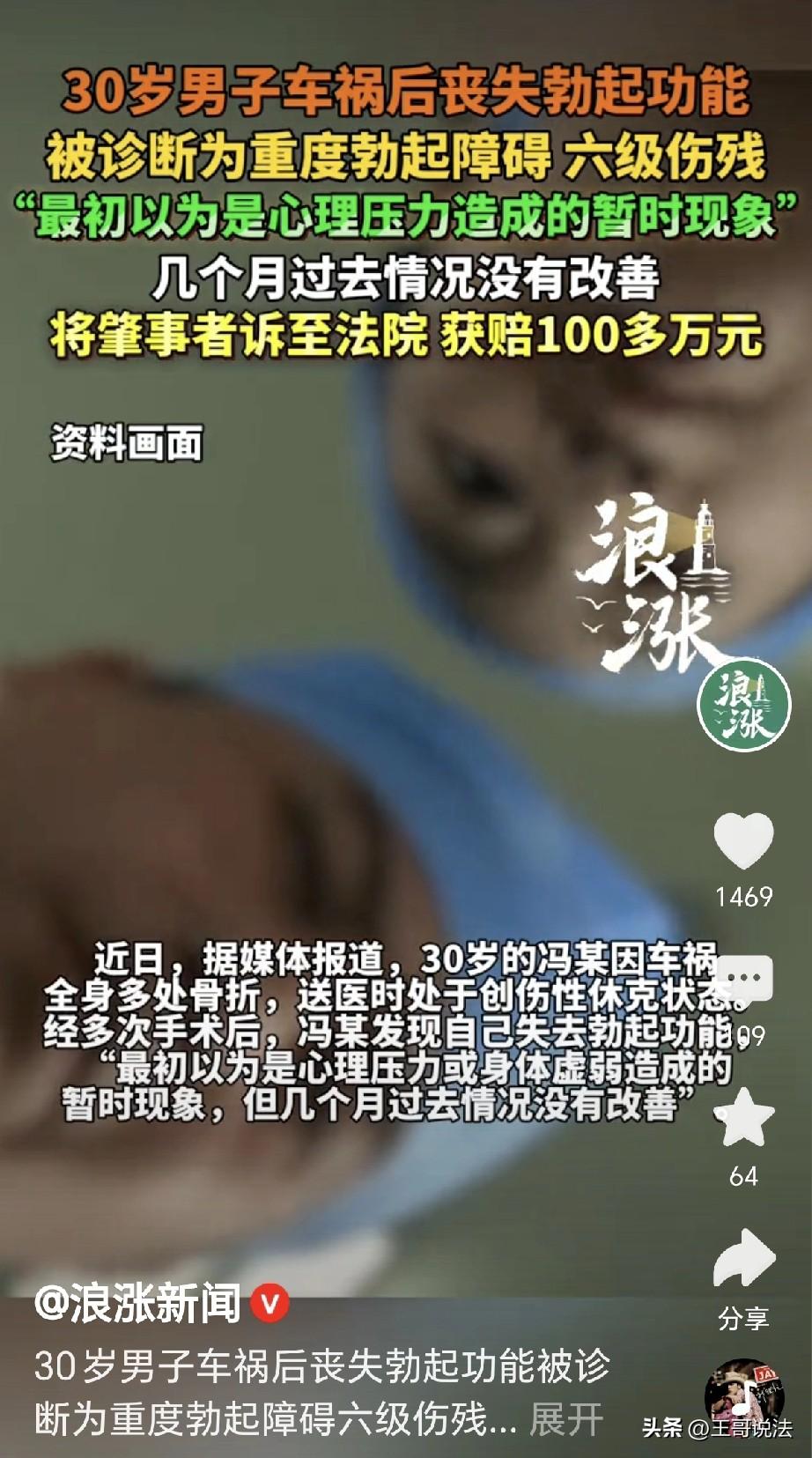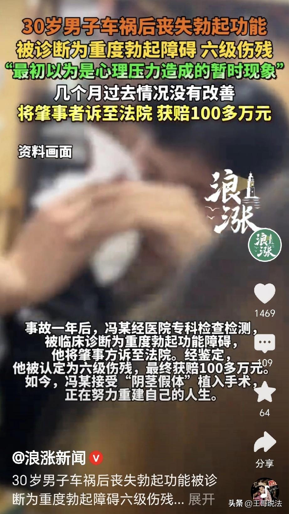 “幸福还能找回来吗?”一男子遇到车祸,被撞的骨折休克,经过多次手术,男子算是捡回条小命,可是他万万没有想到,他竟然无法勃起了,男子急了,到医院一查,是重度勃起障碍,伤残6级,男子绝望,一纸诉状将肇事者告到法院,获得100万赔偿金,可钱有了,幸福没了,男子决定做yj假体植入手术,网友: 这等于说,一百万买走了男人的尊严,是不是太少了点? 冯某刚满30岁的年纪,他年富力壮,正是人生最好的阶段。 可没有想到,一场车祸改变他的人生,冯某痛不欲生,整个人生都变得灰暗。 原来,冯某出门时遭遇到了车祸,一辆车把他撞到人事不省,创伤休克。 冯某被送往了医院,经过检查,他的全身被撞的多处骨折。 为了让他恢复如常,光手术就做了多次,之后冯某慢慢醒转了,他的身体在慢慢的恢复。 经过一段时间的治疗康复,终于到了可以出院的时候,冯某暗自感叹,自己这是捡回了一条命来。 冯某一开始还庆幸,觉得只要好好养养就能恢复正常生活。 可出院后没过多久,他就发现自己身上出了个问题,他竟然不能再勃起了! 刚一开始,他还没往心里去,只当是车祸后给他造成了心理压力。 更也许是失血过多,又动了手术,大概也是伤了身体的元气。 他安慰自己,也许过几个月之后就能慢慢恢复,毕竟自己曾经经受过那样大的撞击。 可日子一天天过去,冯某的情况丝毫没有好转,他开始查资料、找方子,甚至去看了心理医生。 可是无论如何,都没一点效果,冯某感觉,天都塌了!如果继续不能勃起,作为一个男人,那就意味着尊严扫地! 那种挫败感,让他变得沉默不语,尤其到了晚上,他更觉得对不起妻子! 他经常盯着天花板到天亮,觉得自己已经不是个男人。 从今以后,也体会不到生活的幸福,他越想越气,觉得自己生不如死! 拖了整整一年的时间,冯某鼓起勇气去了医院,可经过检查,医生给出了诊断,冯某重度勃起功能障碍,六级伤残。 冯某彻底崩溃了,原来这不是暂时的,而是一辈子都是如此。 冯某气急了,他想起那场车祸,自己走的好好的,无缘无故就被对方给撞了。 不但多处骨折,受了无数的罪,小命虽然保住了,但是男子功能却被撞出了问题! 这事绝不能就这么完了,冯某告到法院,要求肇事方赔偿自己。 法院委托专业机构做了鉴定,确认他的伤残确实是车祸导致的。 最终,法院判决肇事方赔偿冯某100多万元。 根据《最高院关于审理人身损害赔偿案件适用法律若干问题的解释》规定,男子获得的这100多万赔偿,主要是由残疾赔偿金、医疗费、后续治疗费以及精神损害抚慰金组成。 虽然这看起来只是勃起不行了,但在司法鉴定中,它是根据受害人丧失劳动能力的程度或伤残等级来定的。 拿到赔偿款的那天,冯某没有想象中的开心,他经过咨询,像他这样的情况,只有做个假 体 植入手术。 虽然不能完全恢复到以前的状态,但至少让他重新找回了一点男人的尊严。 有人表示,这妥妥的后半生过活起没意思了,给多少钱也没啥意思了。 也有人说,100多万有什么用?失去了很多快乐,人类最需要的没有了,生不如死啊。 更有人说,你就是给我多钱,我都不要,尊严没了,这个和死了没区别,有和不能用它不是一个概念,哪怕我不用,我也不能没有…… 可经管如此,谁也不想这样,车祸都是意外,既然出了,后果又是如此的严重。 可是,人的一生还是很长,总不能因为这个就不活了,冯某如今只能积极面对。 好在目前医疗发达,目前,他已经接受 假 体 植入手术,积极重建自己的生活。 对此,你怎么看?