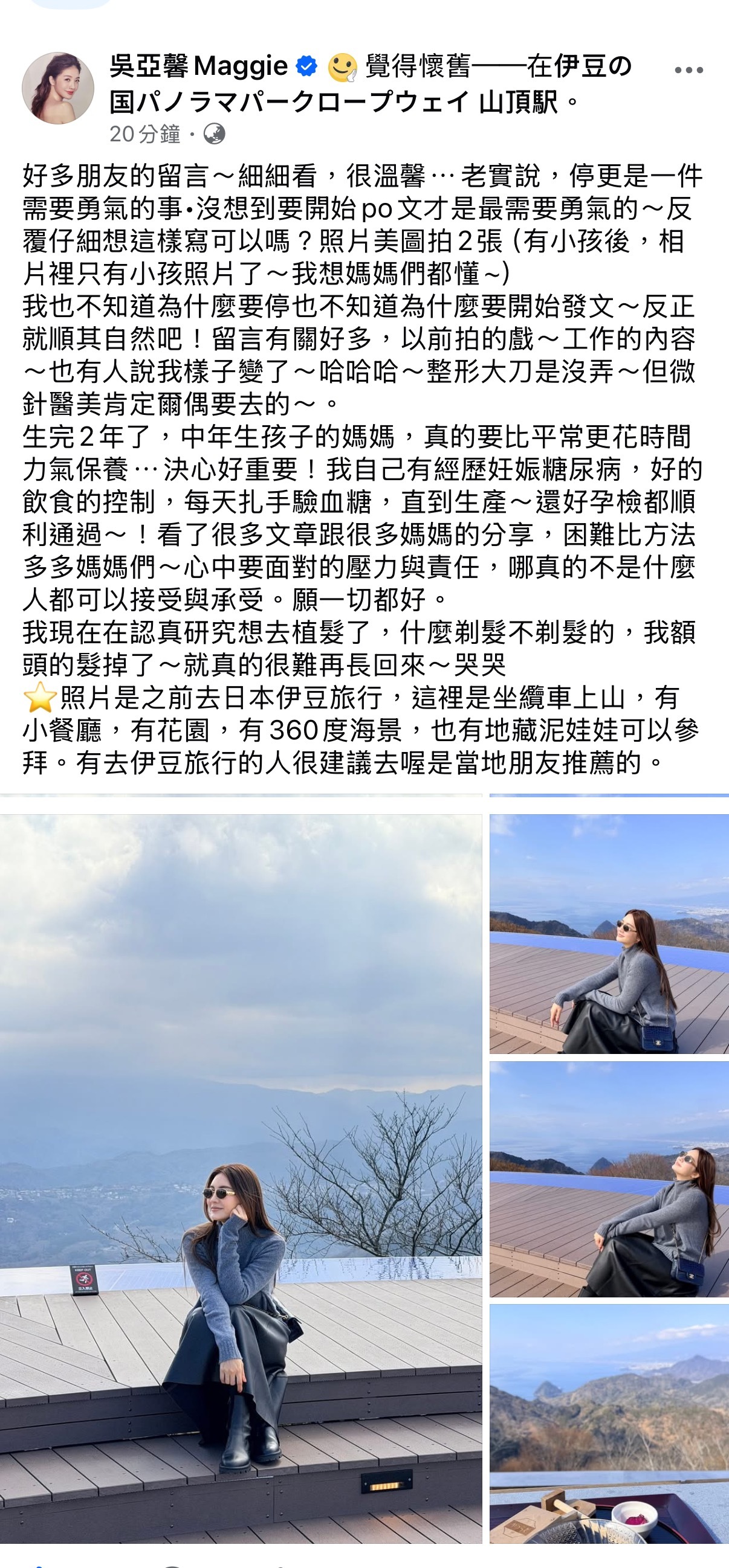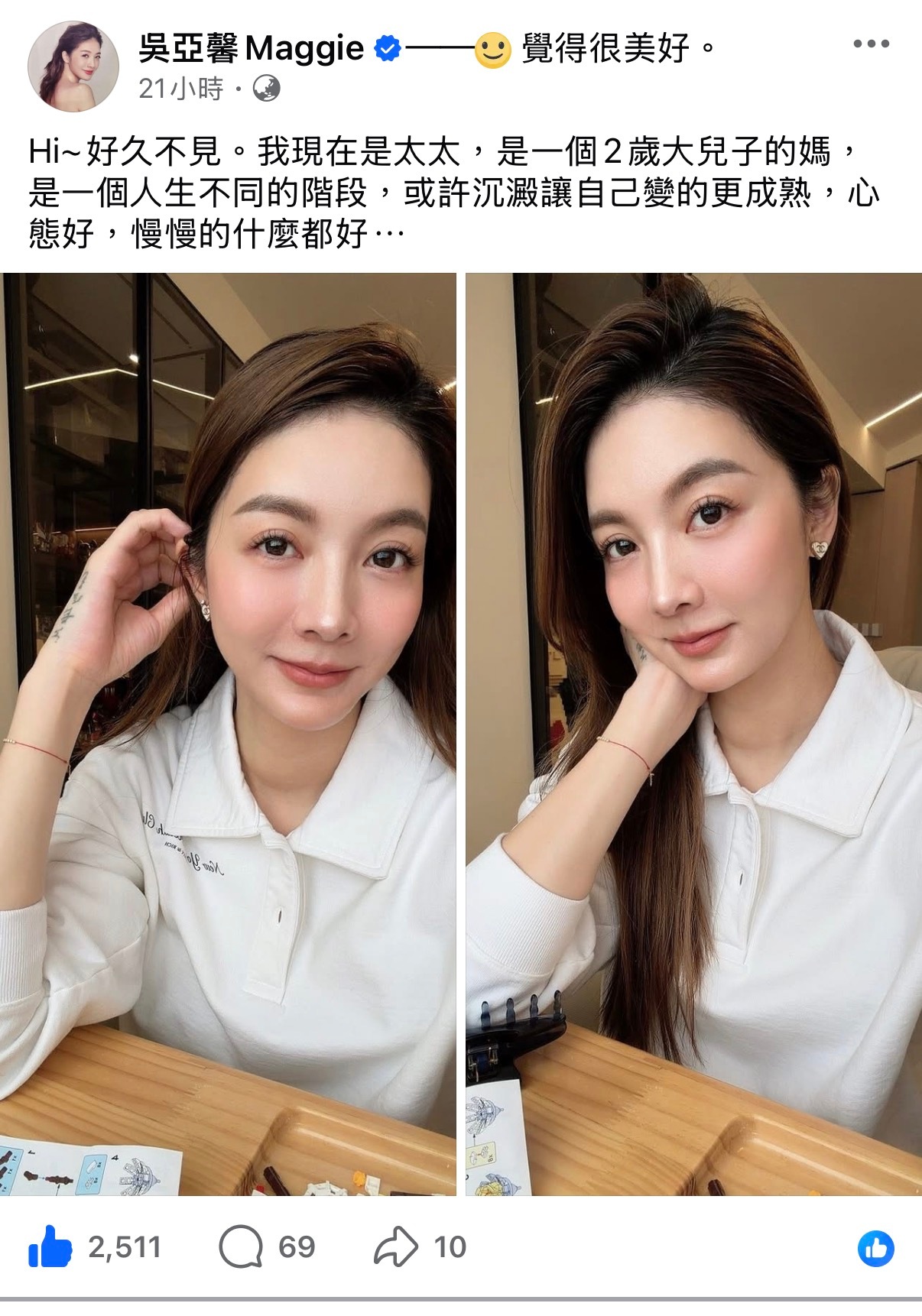 吴亚馨更新近况,42岁的她有个2岁的孩子。她也分享中年生子的经验,还说到自己没搭整,是有去医美。
