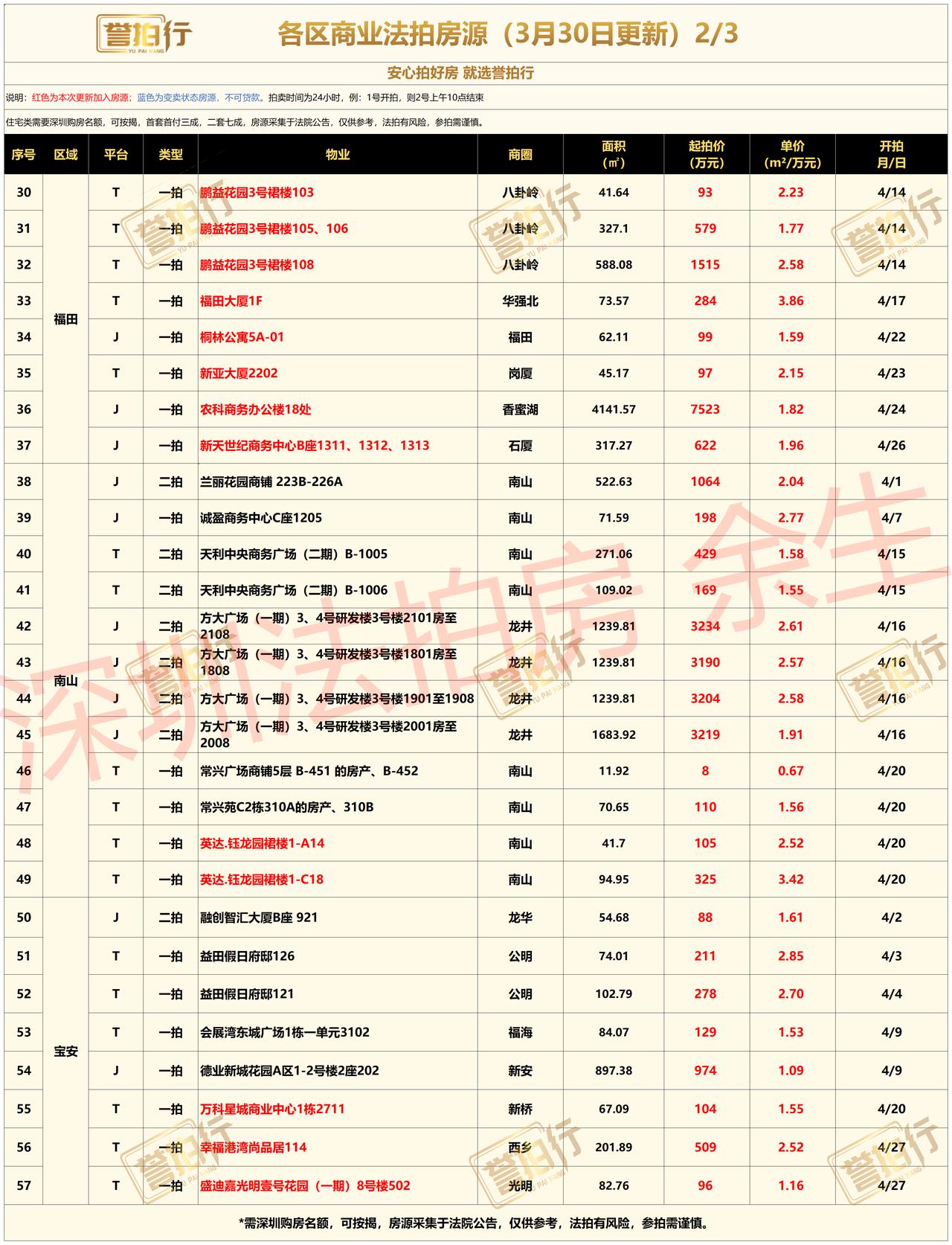 深圳法拍房:各区商业类资产2026年3月30日更新~ 深圳各区商业类物业:包含写字楼、厂房、商铺、裙楼、酒店等各类物业,投资自用首选~