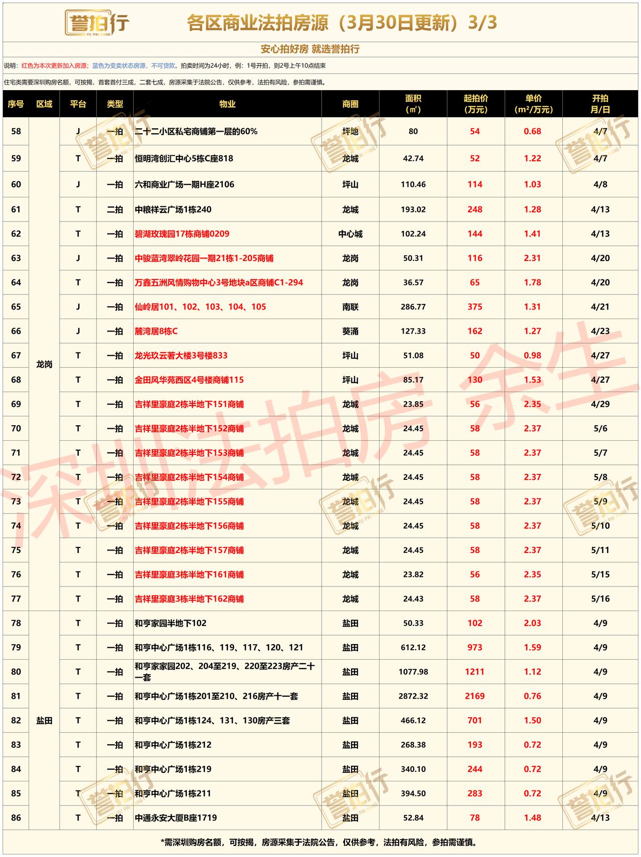深圳法拍房:各区商业类资产2026年3月30日更新~ 深圳各区商业类物业:包含写