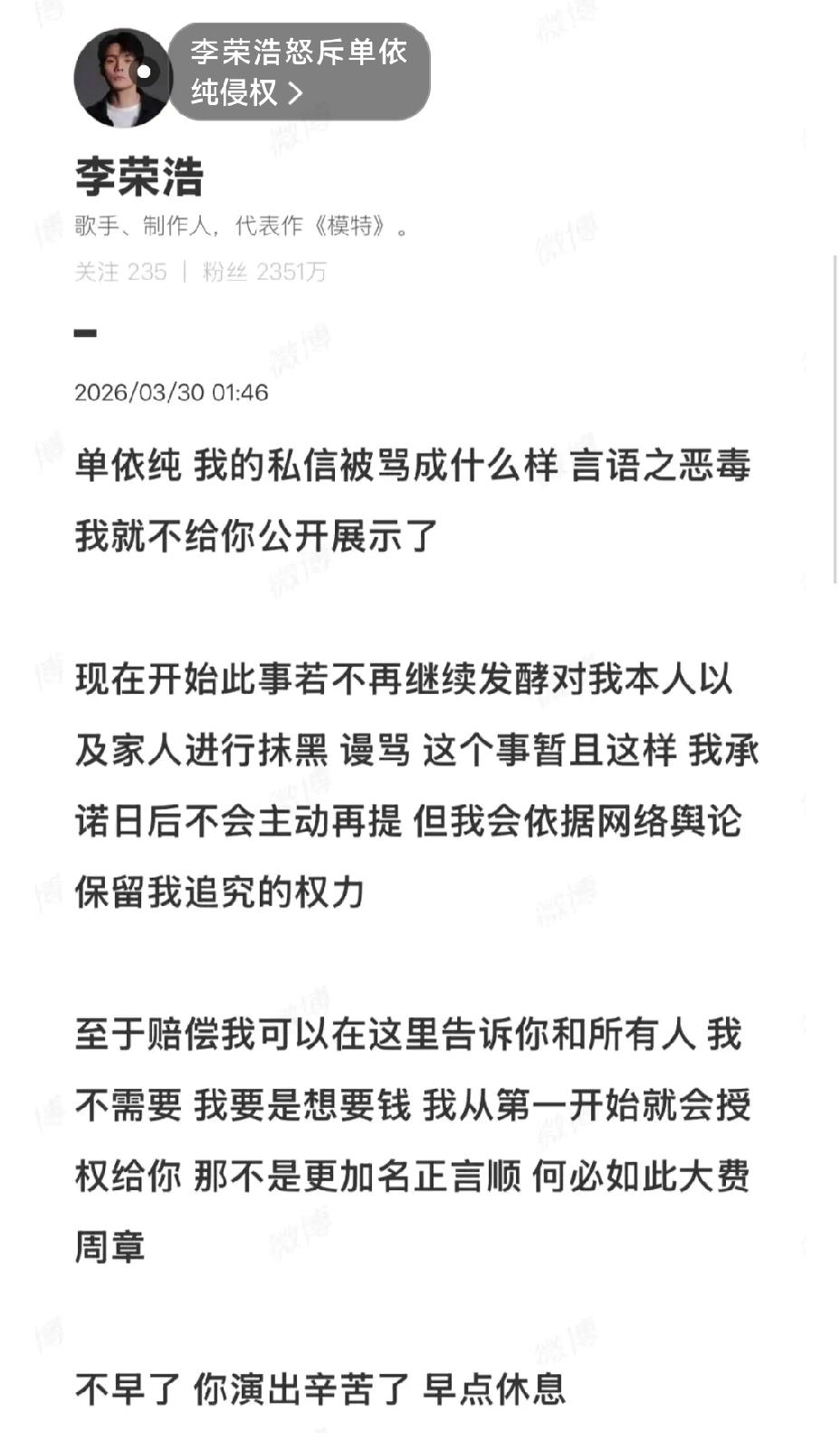 单依纯在自己演唱会唱李荣浩的歌,虽说确实有点不合适,但变相的也是对这首歌的欣赏,同时也是和自己粉丝为这首歌做了免费宣传。本身也并没有什么恶意,并且事后也诚恳的道歉了。 当然,李荣浩维护自己创作的合法权益,也是应该的。但娱乐圈不就是你唱唱我的,我唱唱你的,大家抬头不见低头见的,真没必要闹得那么僵。 大家约个时间坐下来吃顿饭,该赔礼赔礼,该道歉道歉,没有什么解决不了的问题。