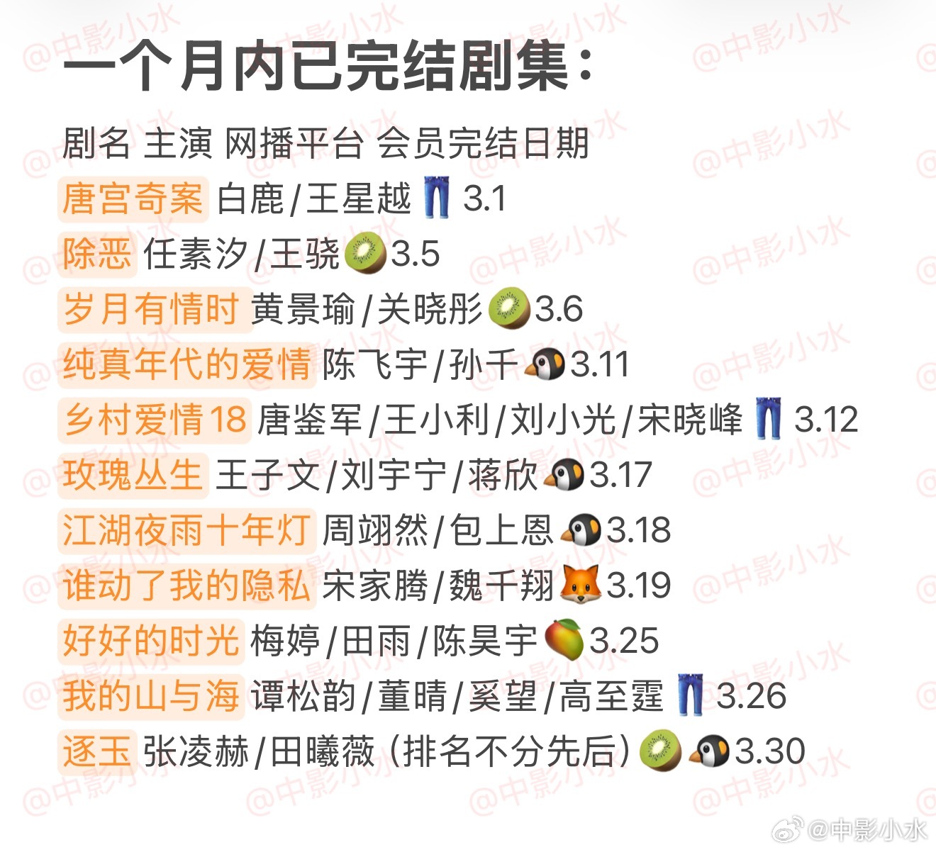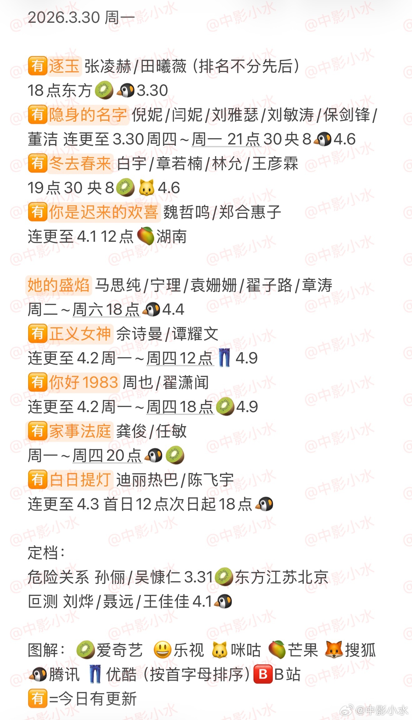 拯救剧荒 3月30日,今晚看点啥??图1 追剧日历 图2 综艺日历 图3 已完结剧集 🈶逐玉 张凌赫/田曦薇(排名不分先后)🈶隐身的名字 倪妮/闫妮/刘雅瑟/刘敏涛/保剑锋/董洁🈶冬去春来 白宇/章若楠/林允/王彦霖🈶你是迟来的欢喜 魏哲鸣/郑合惠子