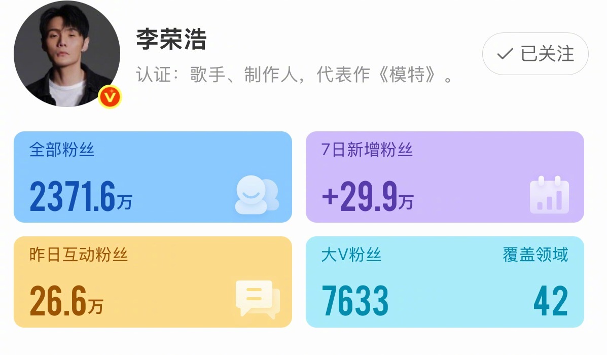 李荣浩这波喊话单依纯后,粉丝量怒涨近30万,主页访问量1913万!妥妥的“爱你老己”的野生代言人了属于是!李荣浩 民选微博King李荣浩 爱你老己