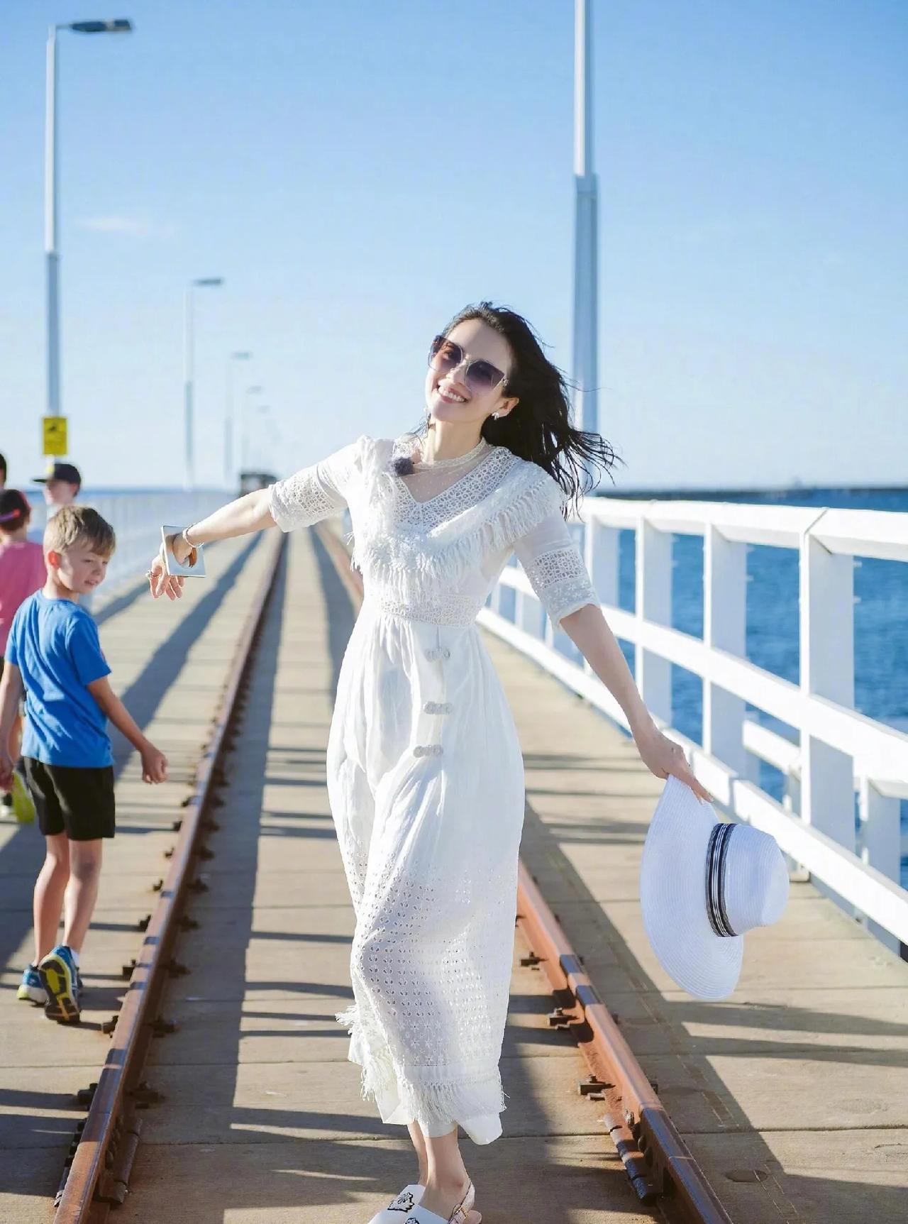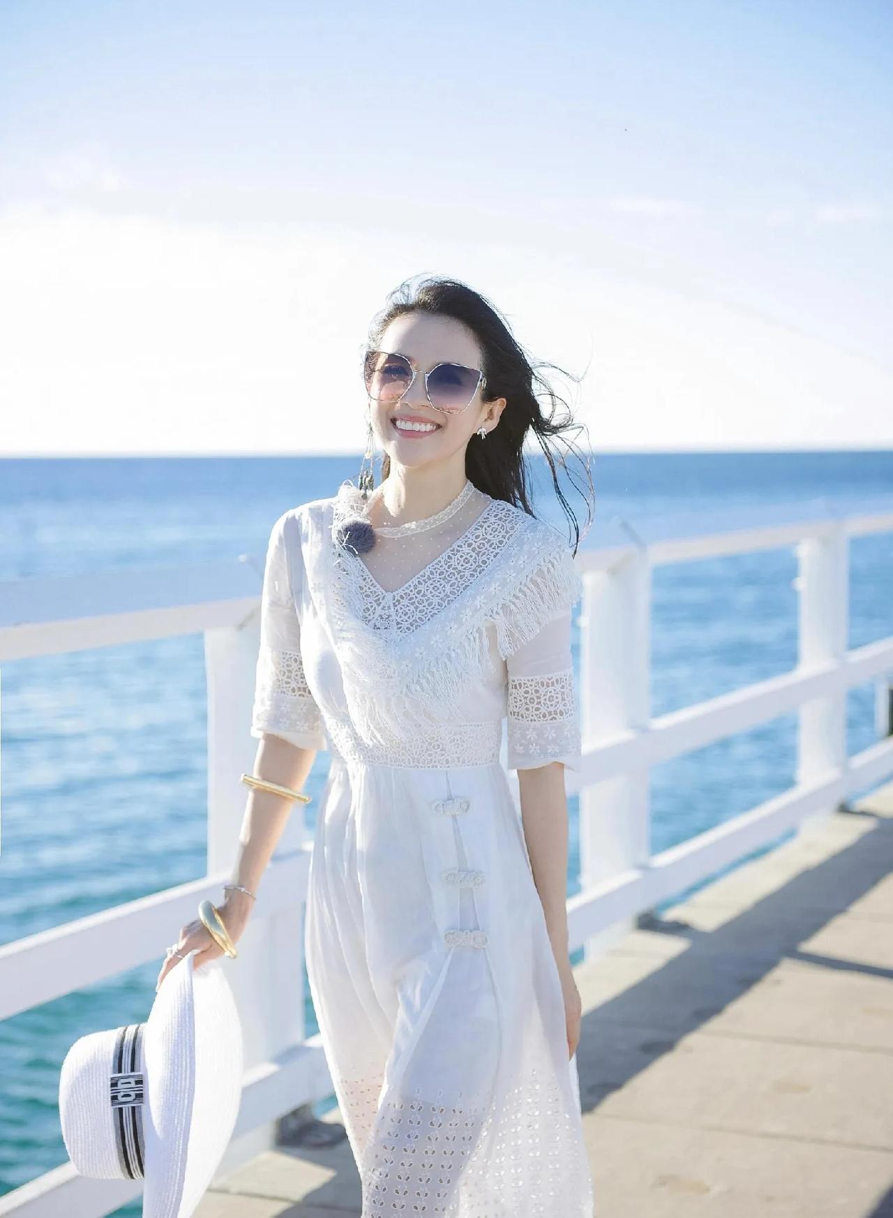 白裙+墨镜+金饰,把优雅与随性焊在身上!蕾丝设计藏住年龄感,搭配宽版手镯,甜酷又减龄,海边拍照直接出片,日常度假照着穿准没错! 章子怡 海边穿搭