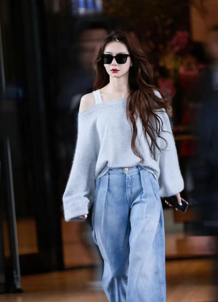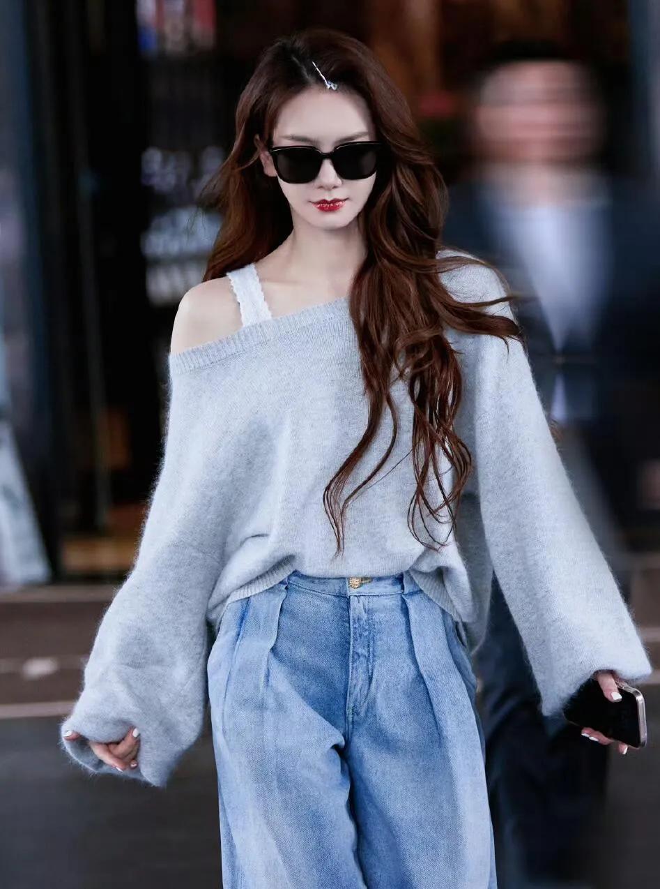谁懂啊!戚薇这套私服看着就舒服!软乎乎的露肩毛衣+阔腿牛仔裤,藏肉又显腿长,还带