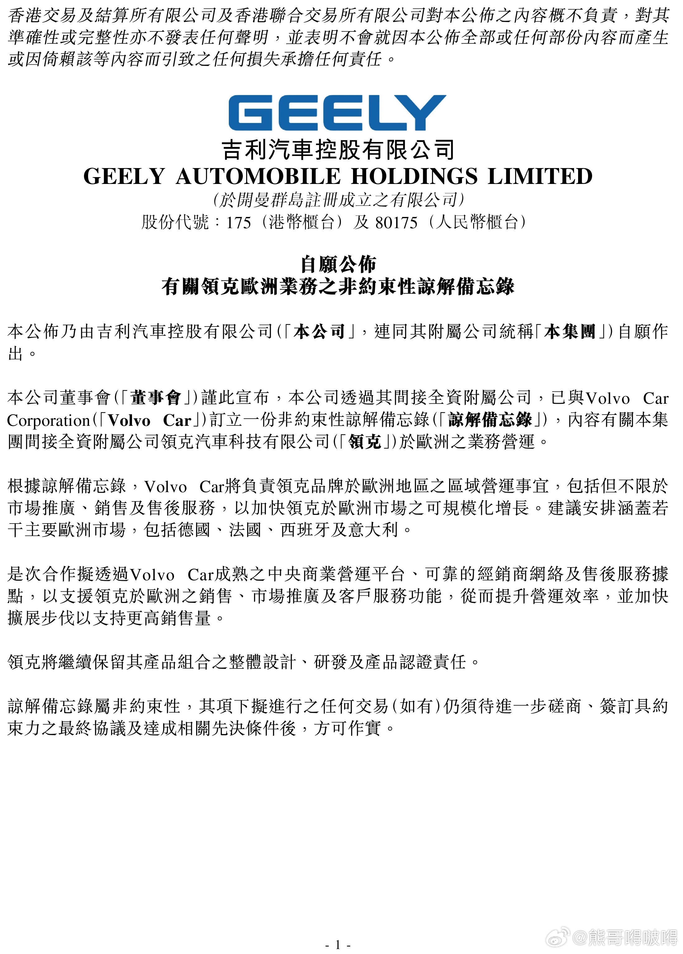 沃尔沃汽车将负责领克欧洲区域营销业务 深度协同赋能品牌高质量发展2026年3月30日——沃尔沃汽车与吉利汽车签署了一份非约束性谅解备忘录(MoU),拟就领克在欧洲建立新的商业合作伙伴关系。根据该谅解备忘录,沃尔沃汽车拟负责领克在欧洲的商业及品牌运营。此次合作旨在通过深度协同,加速领克在欧洲市场的规模化增长。自2016年在欧洲发布以来,领克品牌已建立起强大的品牌号召力与高黏性的用户生态。本次合作将充分发挥沃尔沃汽车在欧洲区域卓越的运营能力与完善的终端网络优势,推动领克在欧洲市场实现更高效的规模化跃升,以满足日益增长的市场需求。本次合作不涉及股权架构变更,领克品牌仍属于吉利汽车集团,在全球范围内主导其产品设计、研发及合规认证等核心业务。