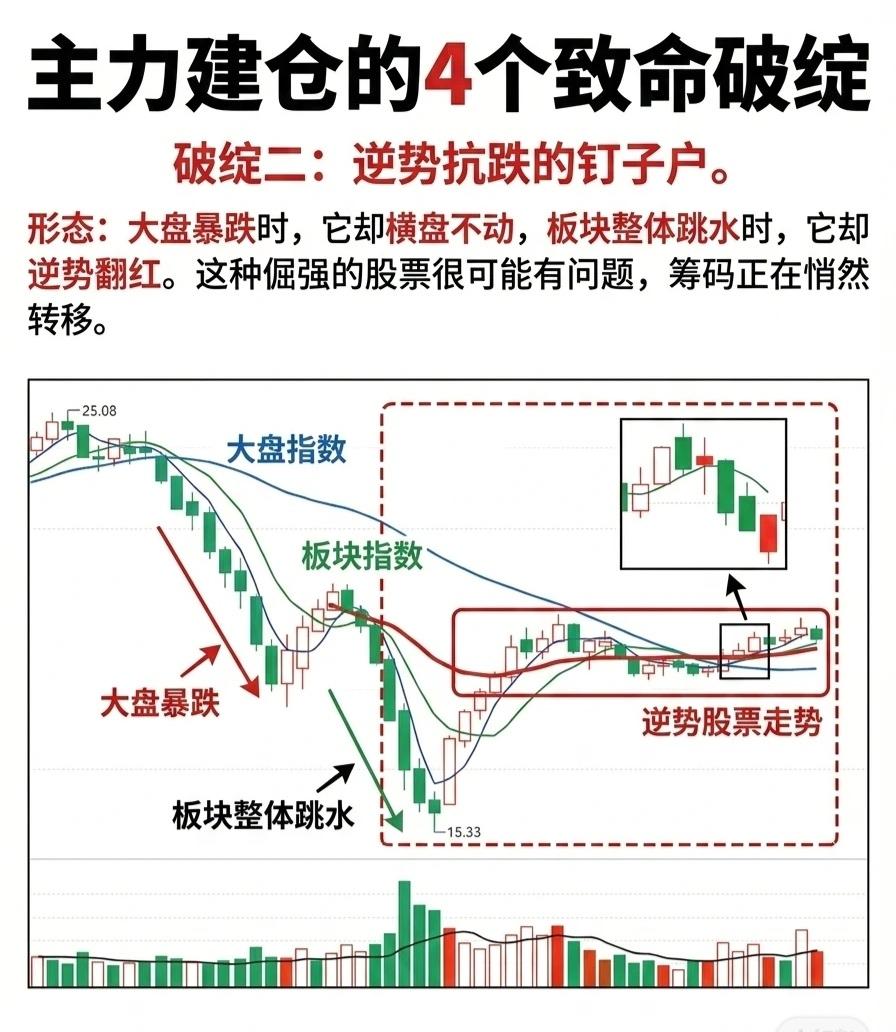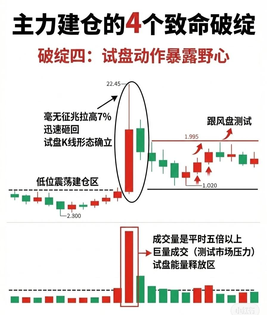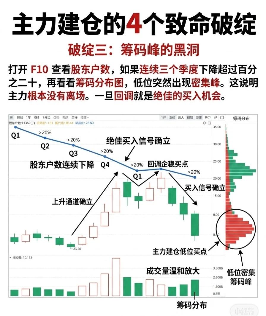 主力建仓的4个致命破绽(收藏学习) 破绽一:成交量异常飙升 形态:股价持续下跌、不断创出新低(绿色K线)的过程中,成交量(柱状图)突然出现一根远大于周边量柱的“天量柱”。同时K线呈现剧烈波动,带有长上影线——这是主力通过对倒手法偷偷吸筹的信号,而非散户恐慌抛售所致。 关键特征:尽管盘中波动剧烈,但收盘价最终精准卡在某一水平台阶或关键价位上。“天量成交量”(红色巨量柱)是主力进场的核心标志。操作时需关注盘口卖单被吃掉的频率,避免盲目抄底。 破绽二:逆势抗跌的“钉子户” 形态:大盘暴跌时,个股却横盘不动;板块整体跳水时,它反而逆势翻红。这种“倔强”的走势往往暗示筹码正在悄然从散户向主力转移,股票存在主力控盘的潜在信号。 关键特征:通过对比大盘指数、板块指数与个股K线走势,可清晰识别“逆势抗跌”的形态。当市场普跌而个股独立走强时,需警惕主力借机吸筹的可能。 破绽三:筹码峰的“黑洞” 判断方法:打开F10查看股东户数,若连续三个季度下降超20%,再结合筹码分布图观察——若低位突然出现密集筹码峰,说明主力未离场,筹码正逐步集中。 关键特征:股东户数持续锐减+低位筹码密集,构成主力建仓的典型信号。一旦股价回调至该区域,便是绝佳的买入时机(如“回调企稳买点”“买入信号确立”等阶段)。 破绽四:试盘动作暴露野心 形态:股价在低位震荡建仓后,突然毫无征兆拉高约7%,随后迅速砸回——这种“试盘K线”形态确立时,成交量会放大至平时的五倍以上(巨量成交),属于主力测试市场压力、释放试盘能量的行为。 关键特征:试盘后股价往往伴随“跟风盘测试”的小幅波动,通过量能和K线形态可识别主力的拉升意图。若试盘成功(跟风盘积极),后续上涨概率提升。 (注:以上内容为技术分析逻辑,实际操作需结合市场环境、基本面等多重因素,请勿单一依赖技术指标决策。)