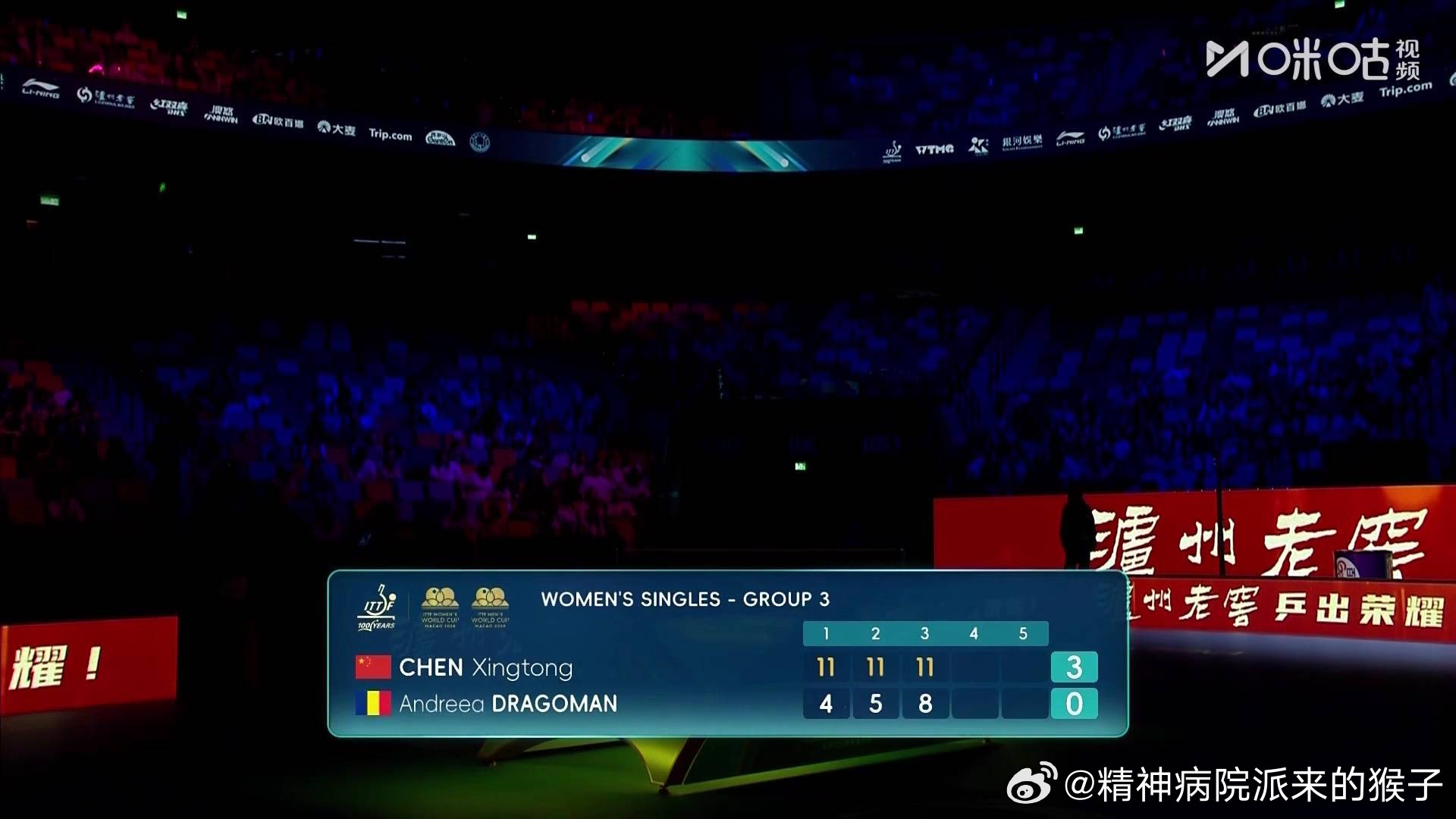 陈幸同3比0德拉戈曼(4,5,8)2026年澳门乒乓球世界杯女单小组赛第3组目前