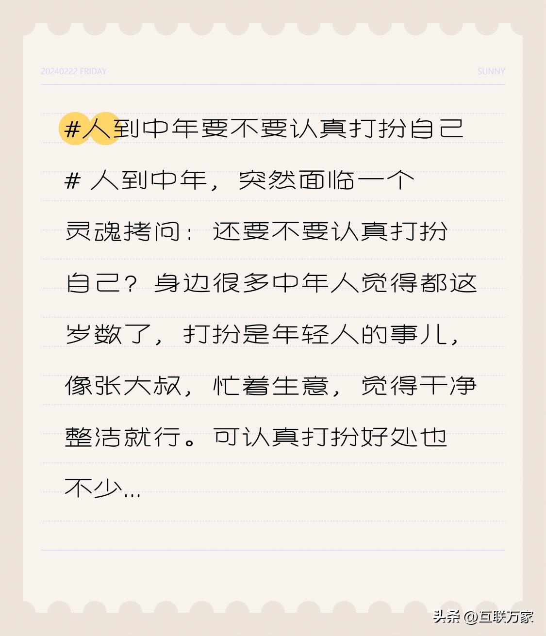 人到中年,突然面临一个灵魂拷问:还要不要认真打扮自己?身边很多中年人觉得都这岁数了,打扮是年轻人的事儿,像张大叔,忙着生意,觉得干净整洁就行。可认真打扮好处也不少啊!从心理上说,打扮能提升自信,李阿姨打扮后都更爱社交了;职场上,穿着得体的中年职场人,会给人专业靠谱的感觉。 人到中年,打扮和内在修养真的只能二选一吗?打扮是虚荣表现,还是对生活的积极态度?内在和外在,真能相互促进吗? 中年女性精致感 中年女气质穿搭 中年穿衣 中年女性精致感 打扮心得 五十岁穿衣 中年女洋气穿搭 中老年人打扮