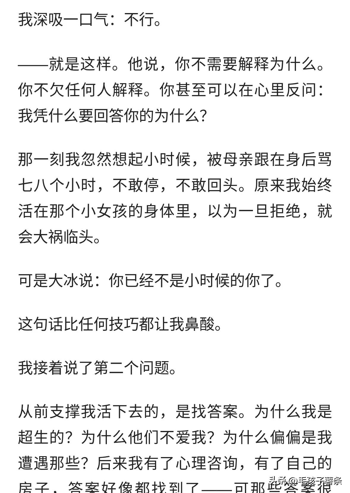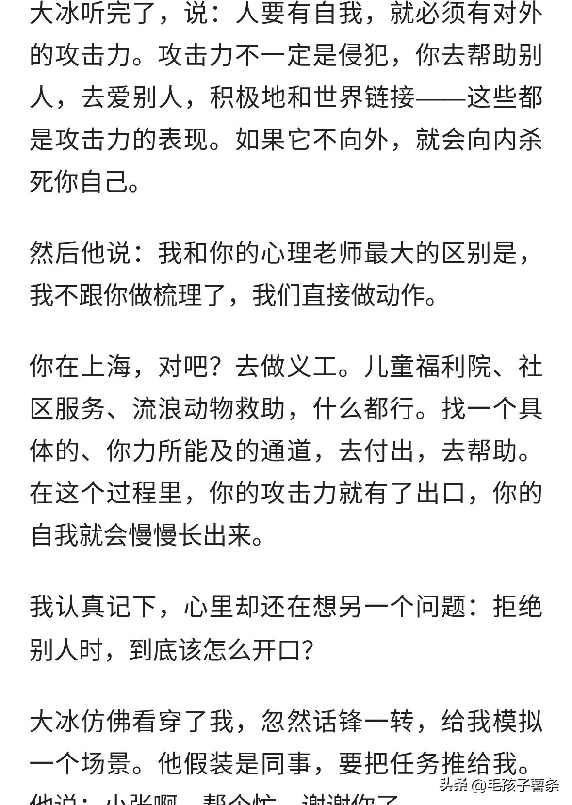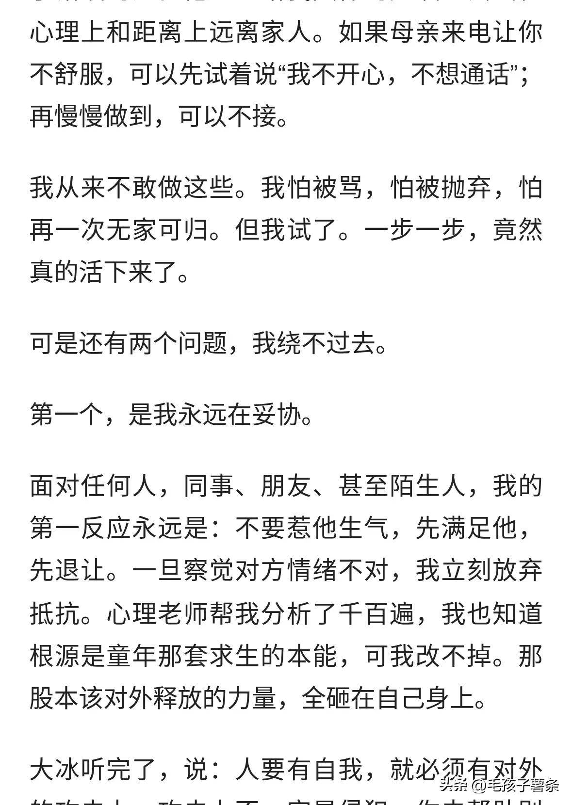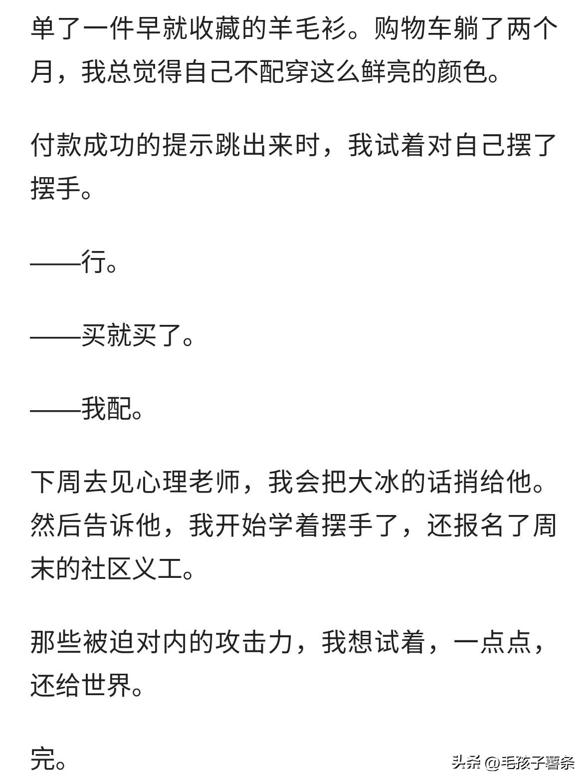 不会拒绝别人的人,讨好型人格的人,自卑的人,对别人总是妥协的人看过来,记住大冰老师的话,要学会说“不行”,自信一点,对自己好一点,别活亏了。 从大冰直播间出来,她打开购物软件,下单了一件羊毛衫,这件羊毛衫在购物车里躺了两个月,以前她觉得这件羊毛衫颜色新鲜,她配不上,现在她觉得她配得上好看的衣服和热腾腾的生活,她要好好活。 图自网络侵必删