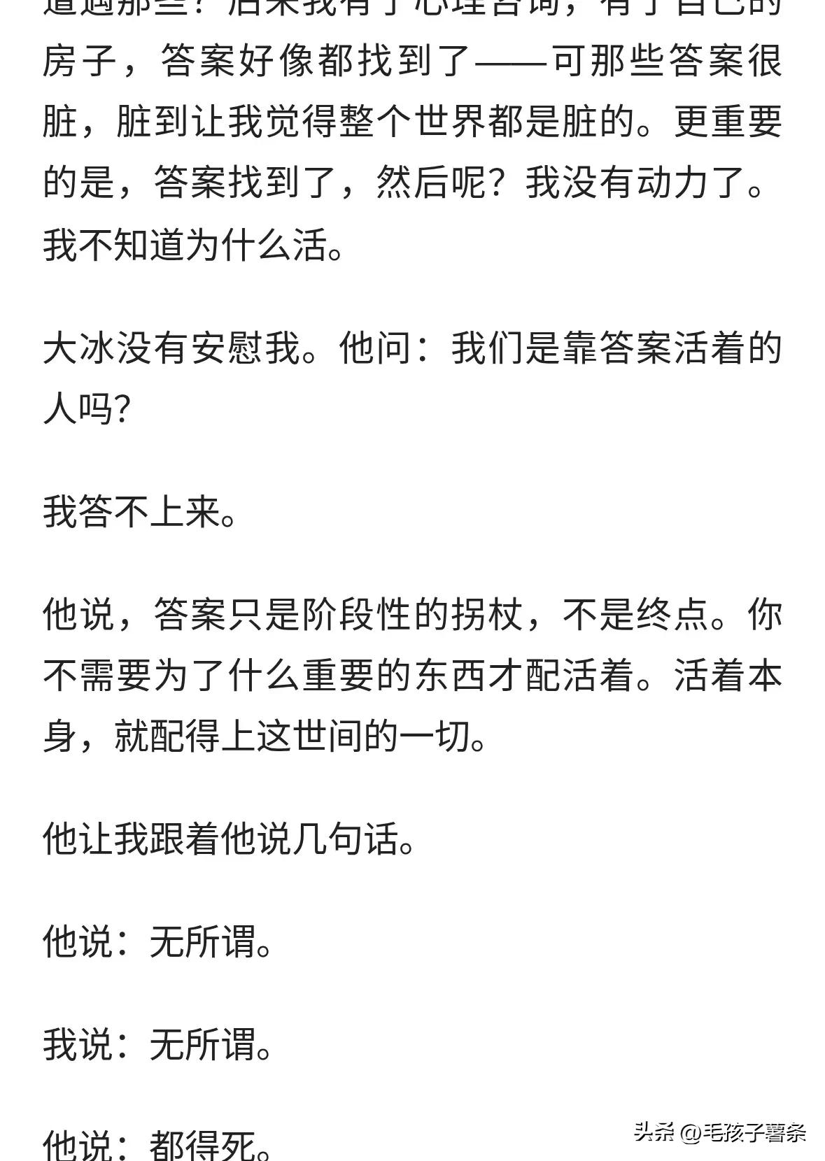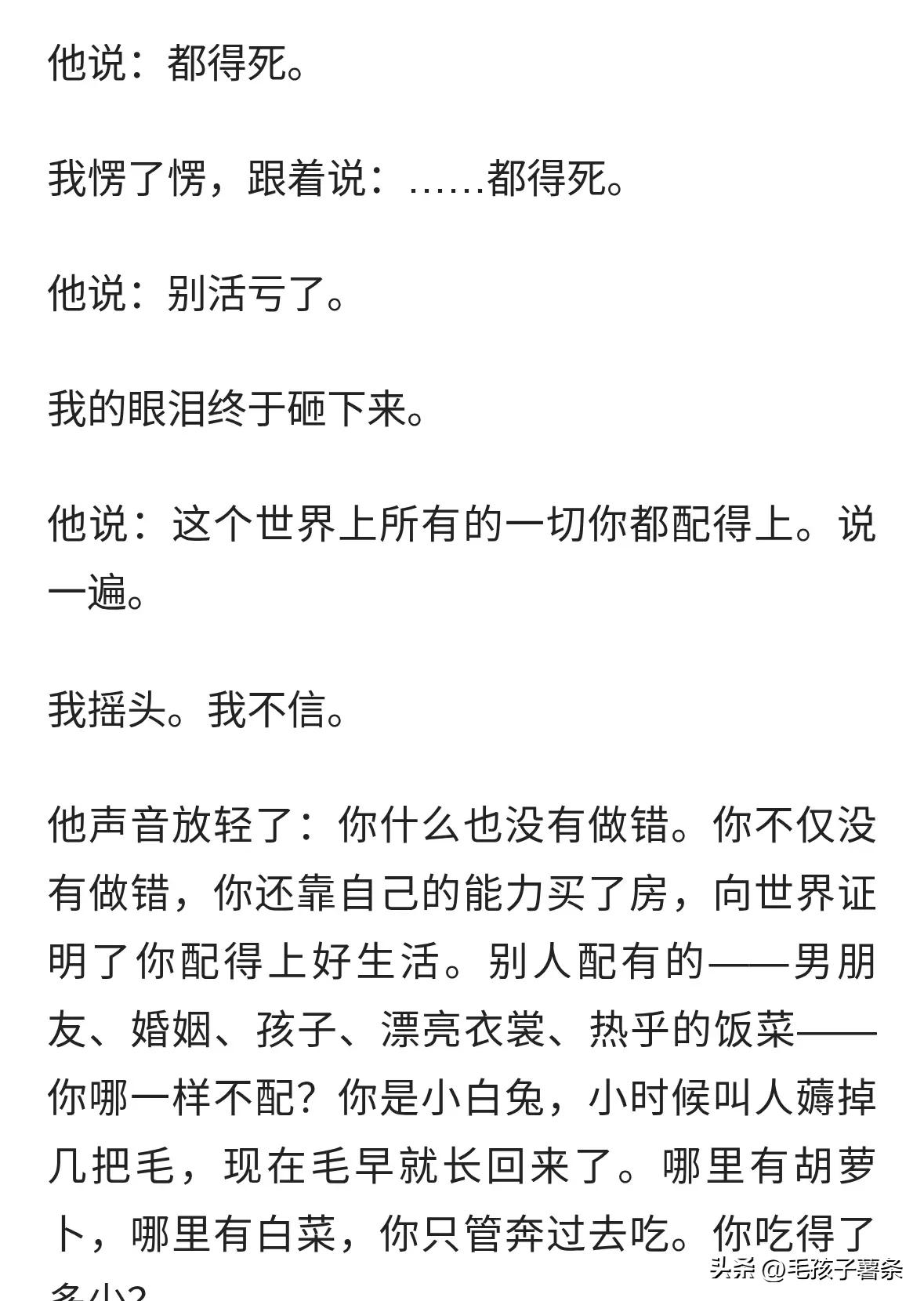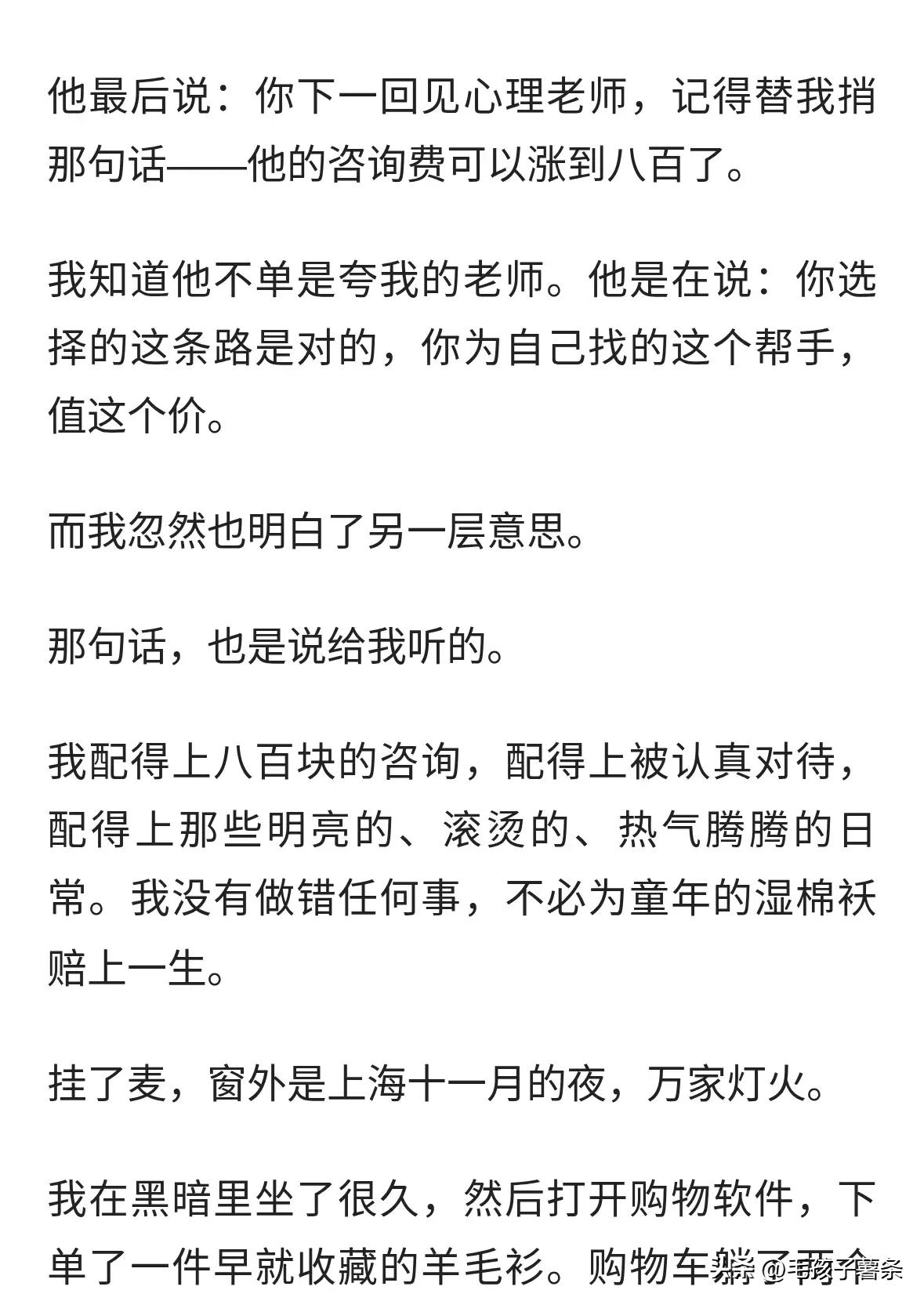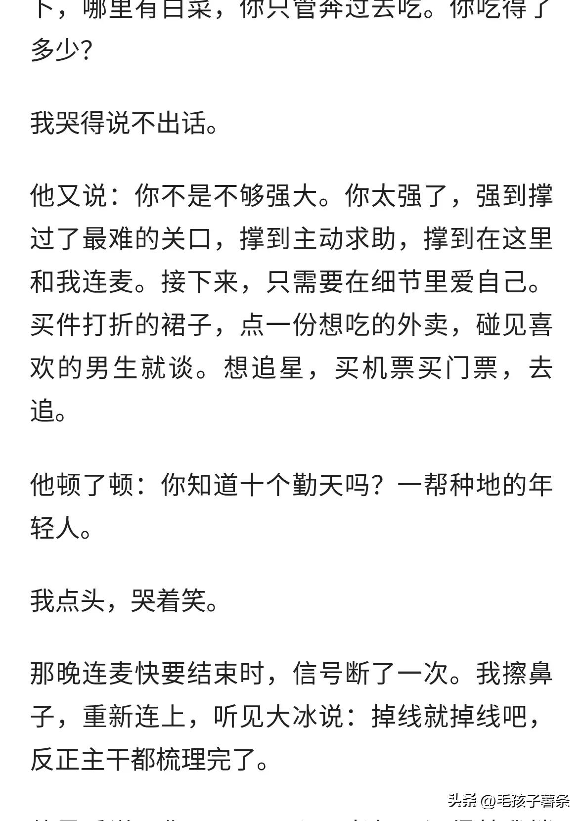 不会拒绝别人的人,讨好型人格的人,自卑的人,对别人总是妥协的人看过来,记住大冰老师的话,要学会说“不行”,自信一点,对自己好一点,别活亏了。 从大冰直播间出来,她打开购物软件,下单了一件羊毛衫,这件羊毛衫在购物车里躺了两个月,以前她觉得这件羊毛衫颜色新鲜,她配不上,现在她觉得她配得上好看的衣服和热腾腾的生活,她要好好活。 图自网络侵必删