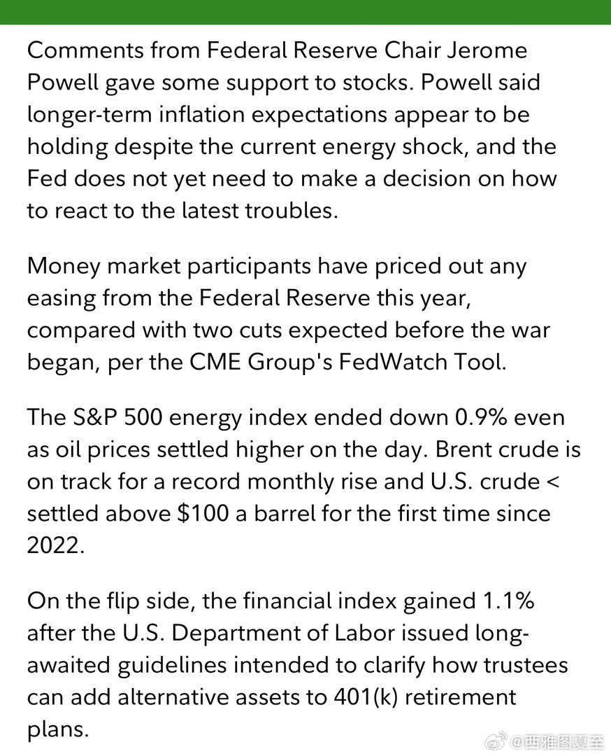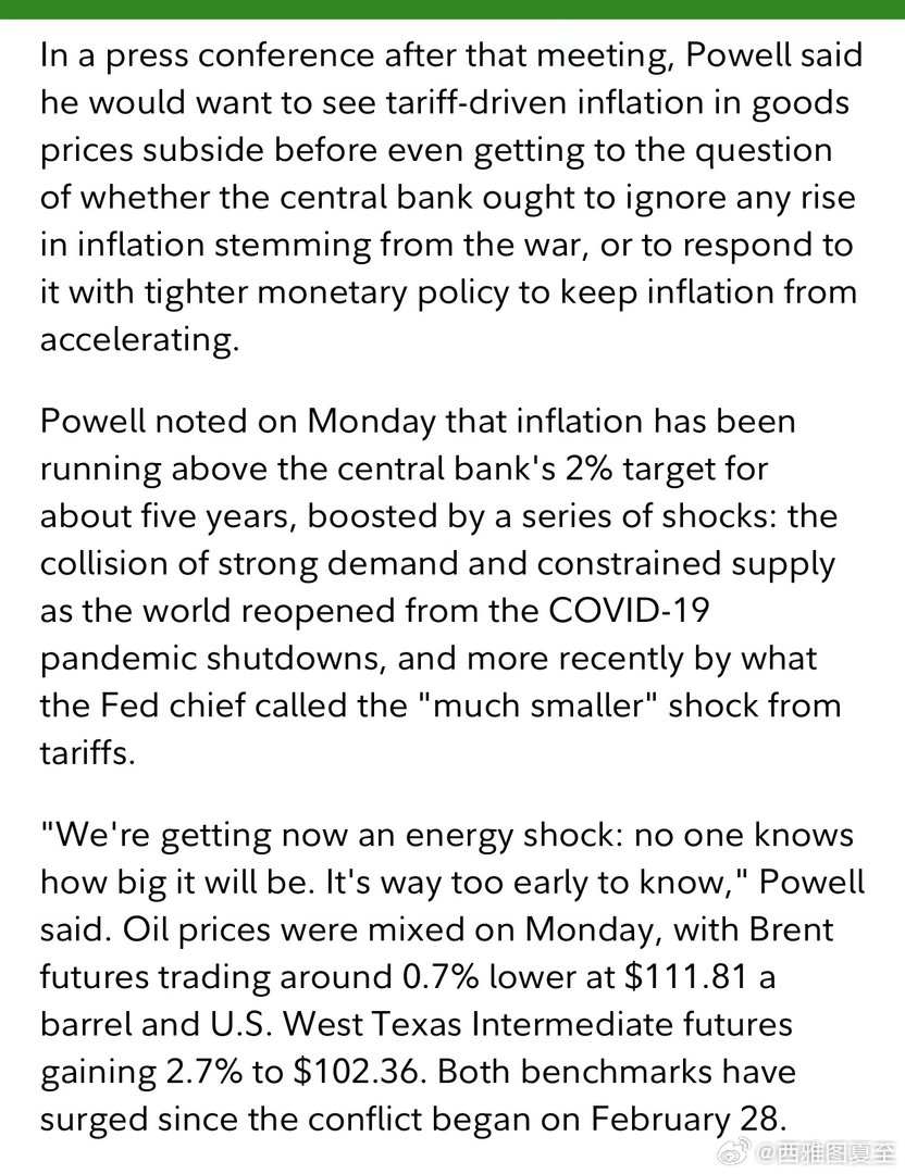 美联储主席讲话:政策合适、不急调整…关税导致的物价上涨,进一步缓和后,再考虑如何应对战争导致的通胀…疫情期间的供需失衡,对物价影响最大,关税的影响小得多,最新的能源危机,影响尚不明确,改政策方向为时过早…