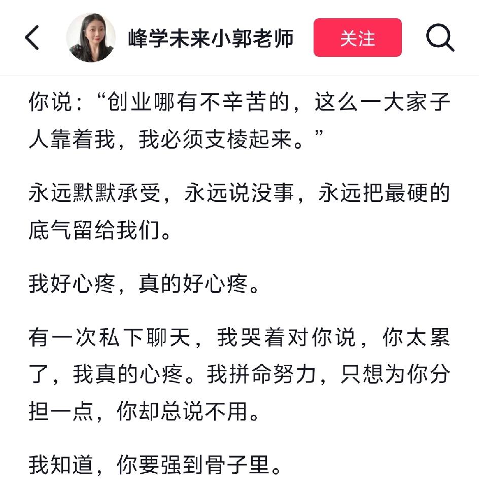 张老师离开的第7天,他的员工小郭姑娘和武亮先生发了长文。没有职场上的人走茶凉,没有散伙分家。 小郭姑娘就是在直播中给张老师送蘸酱菜的那位。张老师真的很容易满足,他一次在直播的时候,一个东北的老乡也是同事小郭老师,给他整了一大碗的东北蘸酱菜,有葱,胡萝卜青菜之类的,再给他炒一碗酱,对于他来说都已经非常满足了。 小郭是最懂得心疼张老师的员工。她的文字中透露着满满的不舍与心疼,她说我在私底下曾经跟你说过,你太累了,我真的心疼。 试问有哪个公司员工心疼老板心疼到哭的。我尽量拼命的多做一点,替你分担一点,可是你太要强了,要强到骨子里。 告别的话我说不出来啊,我只当你去休息了。 吴良 武亮说,我一定要为张老师写一本传记。张老师骑的电动车已经擦拭好保存起来了。他的账号永远都在,等他的女儿长大了交给她。而我们一定会拼尽全力化悲痛为力量,继续传承张老师的精神文化。 这不是一个公司,这是一个带有情怀创业团体。他们的心是热的,话是真的,爱是不用计算的。