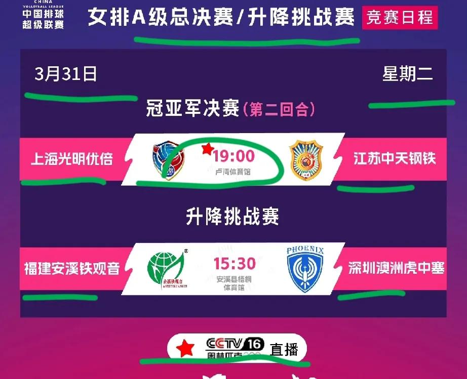 央视今天直播冠亚军决赛!中国排协更新了今天的赛程海报!增加了央视直播信息,央视体育奥林匹克频道CCTV16直播今天晚上的女排决赛第二回合的比赛! 3月31日,2025-2026赛季中国女子排球超级联赛,将展开A级冠亚军决赛次回合以及升降挑战赛的争夺! 周二具体赛程如下: 15:30 福建安溪铁观音 vs 深圳澳洲虎中塞(升降挑战赛) 19:00 上海光明优倍 vs 江苏中天钢铁(冠亚军决赛,CCTV16直播) 今天一共有两场比赛,今天下午三点半升降级比赛!福建女排主场作战对阵深圳女排。一场比赛定胜负!深圳女排有些吃亏客场作战,没有主场比赛。 今天晚上女排决赛第二场比赛,上海女排对阵江苏女排。第二回合上海女排主场作战,占据天时地利人和优势。 今天晚上央视体育奥林匹克频道直播决赛的第二场比赛。央视体育的CCTV5和CCTV5+频道没有安排,而且把比赛安排在了CCTV16频道进行直播!球迷会看比赛直播休息频道变化!另外抖音和央视频也有比赛直播!天涯体育排球讯