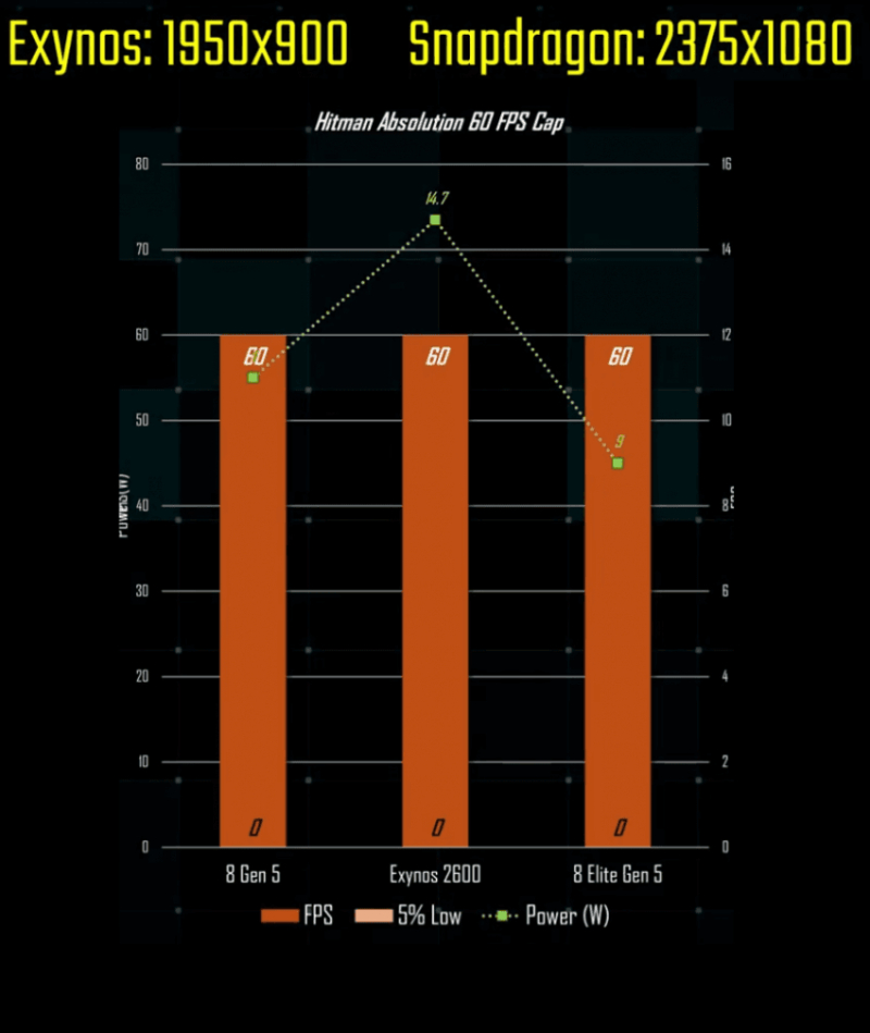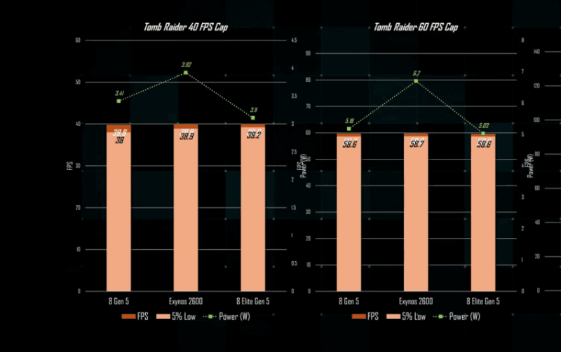 在实际使用层面,这种差距在低负载场景反而被放大。比如低帧率游戏(约 40fps),本来对性能要求不高,但 Exynos 2600 的能效却比骁龙方案差了约 35%,即使是在较低分辨率下也没有改善。这说明问题不只是峰值性能,而是整体功耗控制和调度策略存在短板