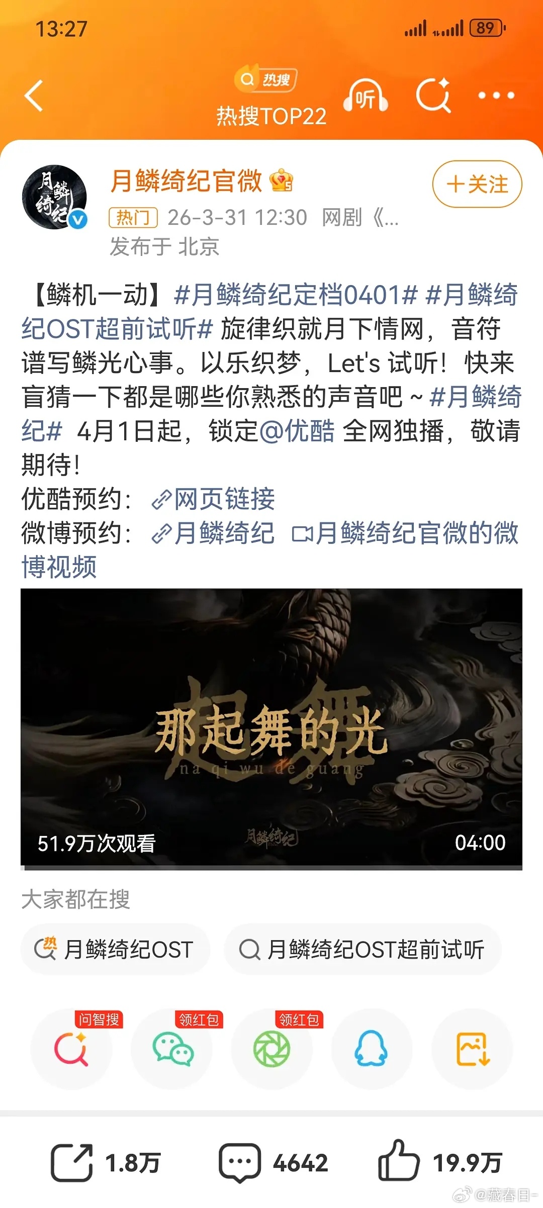 我靠 月鳞绮纪有21首ost,试听有四分钟,而且阵容特别强大,有周深、萨顶顶、毛不易、刘宇宁、刘雨昕、马嘉祺、刘宇……