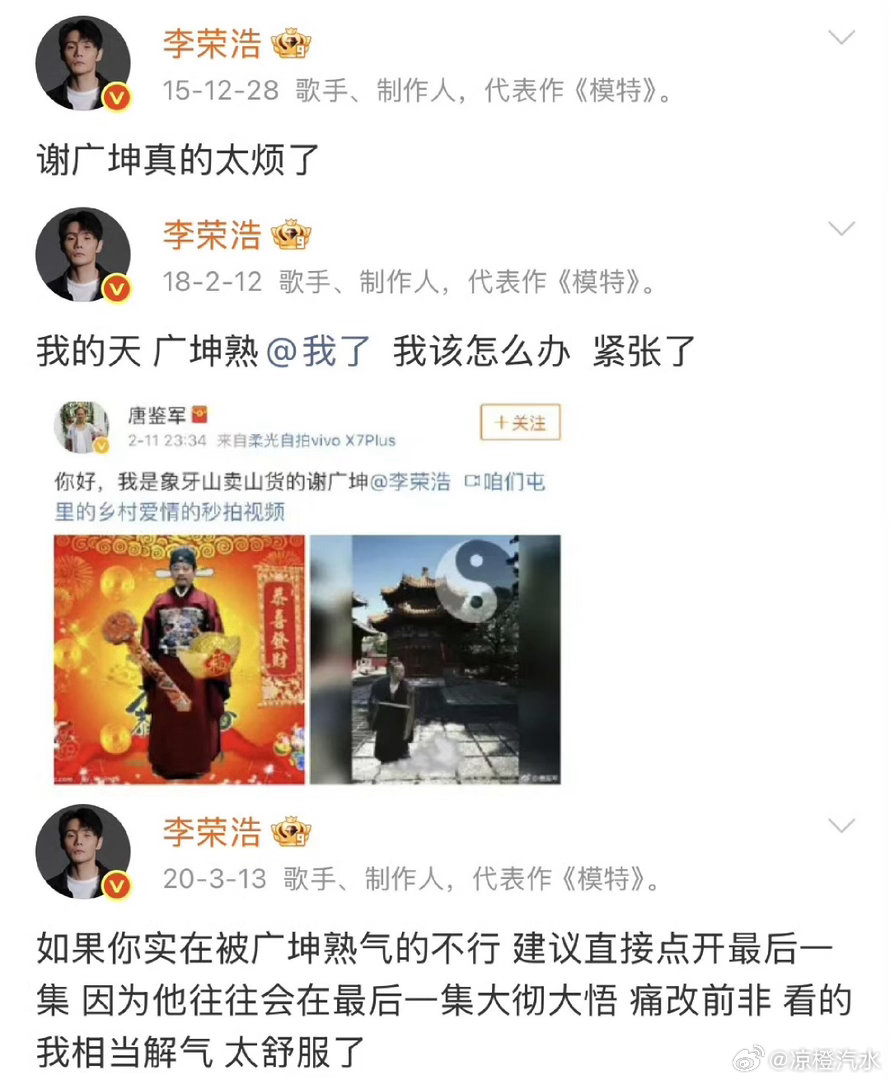 李荣浩曾3次发文吐槽谢广坤h hhhh李荣浩与谢广坤的爱恨情仇