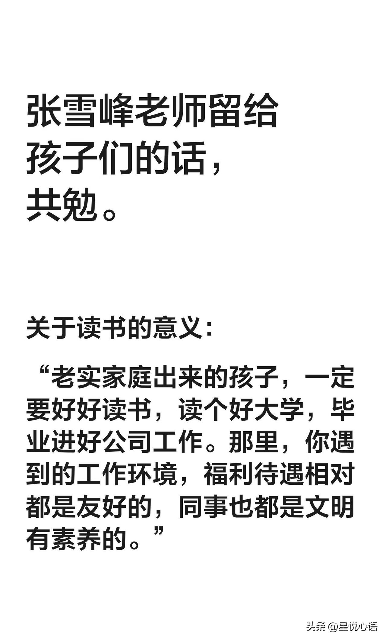 张雪峰写给孩子的这段话,看完沉默了 张雪峰老师留给孩子的一番话,没有华丽辞藻,却句句戳心。 没有高高在上的说教,全是最朴素的人生道理。 他告诉孩子,普通人家的孩子,本就没有太多捷径。读书很苦,但却是最公平、最稳的出路。 不必抱怨出身,不必羡慕别人,走好自己的每一步就够了。 他劝孩子保持善良,但也要有底线。 待人真诚,不耍心机,却也不能任人欺负。 可以平凡,但不能懒散; 可以普通,但不能放弃自己。 很多人说太现实,可这就是生活本来的样子。 没有虚头巴脑的鸡汤,只有过来人掏心窝的忠告。他懂普通家庭的难,懂孩子的迷茫,更懂努力的意义。 这段话不止说给孩子,也说给每一个普通人。 清醒、克制、温柔又有力量。 不贩卖焦虑,只讲实话, 这样的真心,才最让人动容。